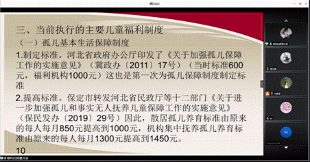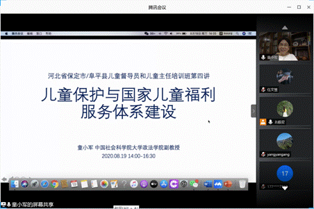 对口帮扶的阜平县的精准扶贫工作,加强当地的基层关爱服务体系建设,提升其儿童督导员、儿童主任的业务能力和关爱水平,保障农村留守儿童、困境儿童的基本生活,我校文法学院决定于2020年8月18日至19日举办“儿童督导员、儿童主任业务能力提升”线上培训班。本次培训对象主要为阜平县及保定市其他区县儿童督导员、儿童主任以及从事儿童工作相关人员。培训通过腾讯会议举行,哔哩哔哩平台同步直播。韩漫库
