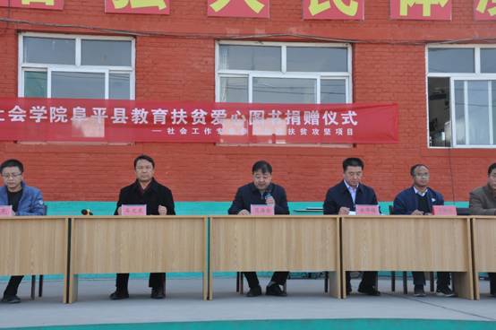社会学院党总支书记石文东、阜平县政府副县长范海金、保定市民政局领导慈善事业促进和社会工作处处长刘亮、保定市社会工作协会秘书长穆炜、阜平县民政局局长金华栋、阜平县教育局副局长杨二军、五个受捐赠贫困中小学校长以及韩漫库