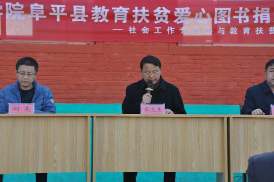 社会学院石文东书记致辞,石书记就我校的基本情况作了简单的介绍,并指出,近几年我校一直积极响应党和国家关于打赢脱贫攻坚战的号召,发挥自身的教育资源优势,对河北省阜平县开展定点教育帮扶,为决战脱贫攻坚贡献一份力量,此举得到了学校领导的大力支持。同时,石书记就高校如何利用自身优势落实精准扶贫战略进行了见解分享,认为智力资源是学校的优势,而智力扶贫更是扶贫工作的重要任务,扶贫攻坚的关键在教育。为了更长久、更全面地促进孩子们成长,为孩子们营造良好的阅读环境,培养他们的阅读习惯,韩漫库