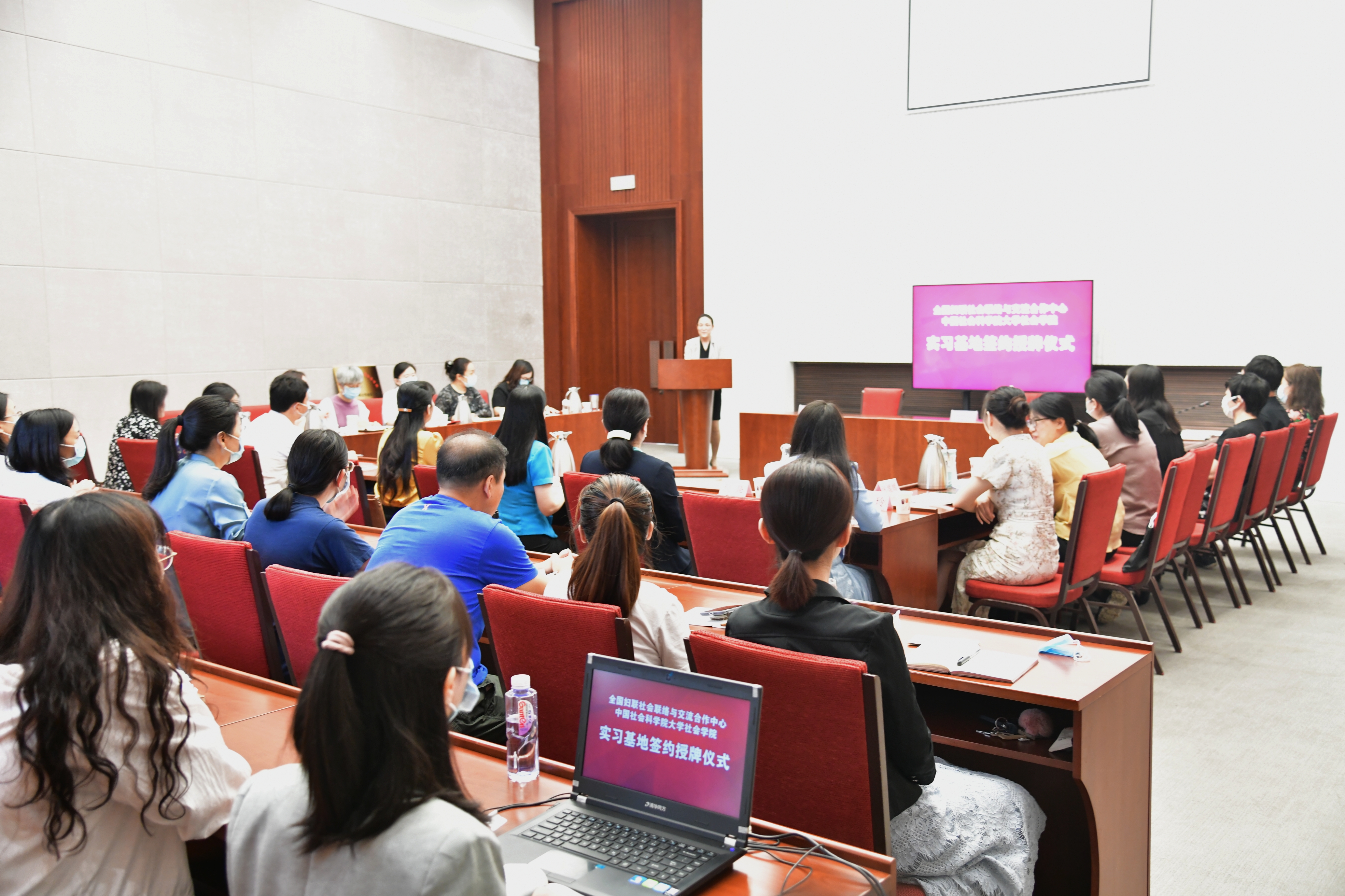 签约授牌仪式由全国妇联社会联络与交流合作中心阿榕主持。全国妇联社会联络与交流合作中心张慧主任致辞。张慧主任代表全国妇联社会联络与交流合作中心,向中国社会科学院大学社会学院前来参加签约授牌仪式的各位老师表示热烈欢迎。张慧主任表示,全国妇联社会联络与交流合作中心与中国社科大社会学院将充分发挥实习基地的平台作用、桥梁作用与模式作用,希望双方能够以实习基地的建立为契机,在全国妇联组织部的关心指导下,进一步加强和拓展交流合作,促进社会组织工作不断发展,共同为建设人人有责、人人尽责、人人享有的社会治理共同体做出积极贡献。