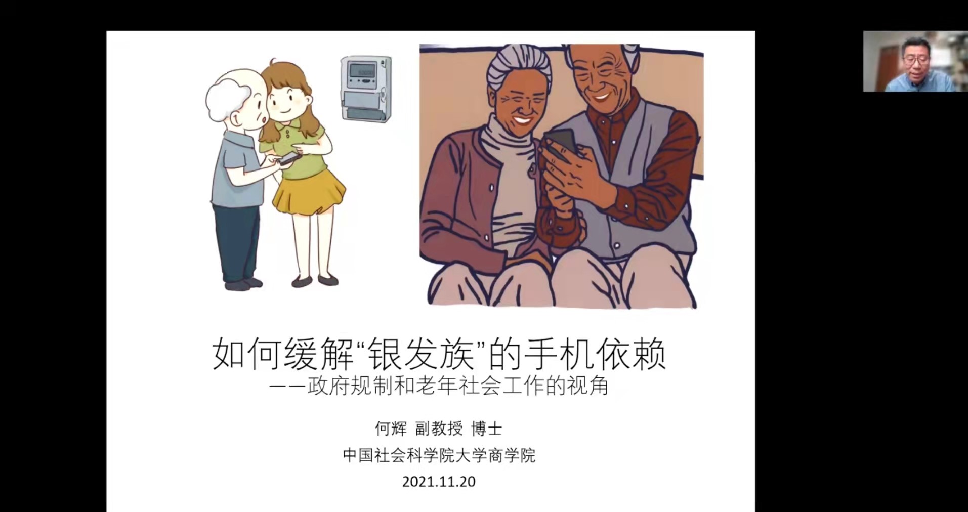 经济学院党总支书记、老年学与社区研究中心成员何辉副教授以“如何缓解“银发族”的手机依赖?—政府规制和老年社会工作的视角”进行分享。他在数据对比分析的基础上,对老年人的网络鸿沟和老年人手机依赖进行对比,区分老年人网络鸿沟主要存在于政务类等学习成本较高的App,老年人的手机依赖主要存在消费和娱乐类App。同时对老年人手机依赖产生的内外部原因、机制、影响及应对措施进行分析。根据克莱顿•奥德弗的ERG理论,人们的需求包括生存、相互关系、成长的需求。而老年人群体同样需要相互关系和成长的需求,并进一步从社会推力和商业拉力两个方面分析了老年人手机依赖产生的原因。老年人手机依赖给老年人的身体心理造成一定的不良影响,且容易受商业不道德如敲诈的危害。并基于“扩展的临床视角”下的企业社工干预提出了四个层面的应对措施。我们需要从政府、企业、社会、社工角度采取措施。关注老年人网络鸿沟的同时,更要关注老年人手机依赖,这是否是老年人心理空虚、社交活动缺乏的另一种表现,这也给老年社会工作提出了新的关注点。