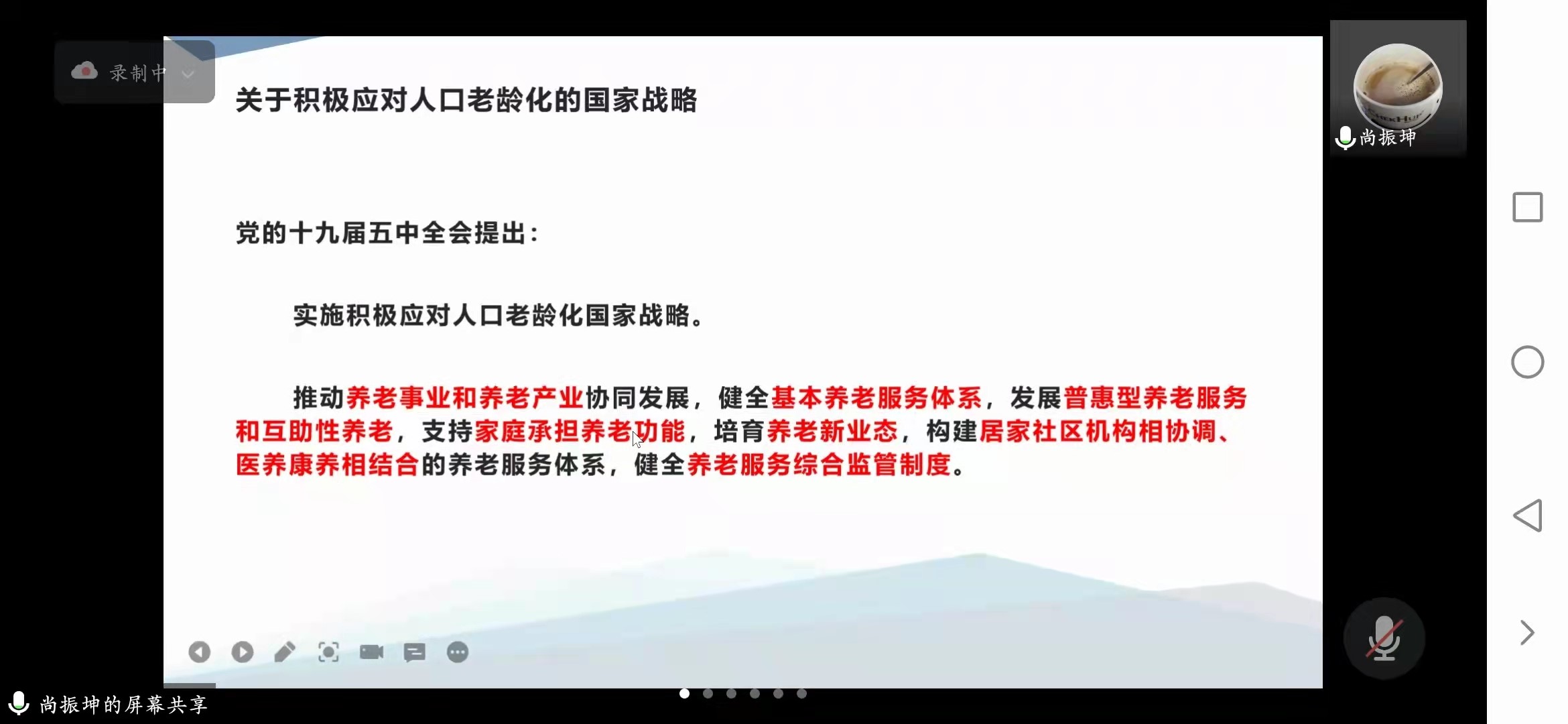 北京市养老服务事务中心副主任尚振坤老师以“养老服务发展与社会工作专业人才需求”为主题,从养老服务政策制定和养老服务发展方向两大方面分析了养老发展对社会工作专业人才的需求。尚老师在政策方面强调:在积极应对人口老龄化国家战略背景下,要推动养老事业和产业协同发展,特别是养老产业的发展。健全基本养老服务体系首要任务是把老年人的基本照料、护理等方面健全起来。发展普惠性和互惠性的养老服务,促进老年人的参与,支持家庭养老。国家在培育养老新业态,构建居家、社区、机构相协调,医养康养相结合的养老服务体系的同时,也要加强对养老服务综合的监管。政府要以养老方面的急难愁盼为导向,推动老龄事业和产业高质量发展,积极发展社区养老,发挥社会力量的作用,满足老年人多层次、多样化需求。同时,重点关注养老服务中的养老服务人员专业化、养老机构建设理念、城区养老服务设备配套建设、标准化建设和目标服务对象聚焦等问题。