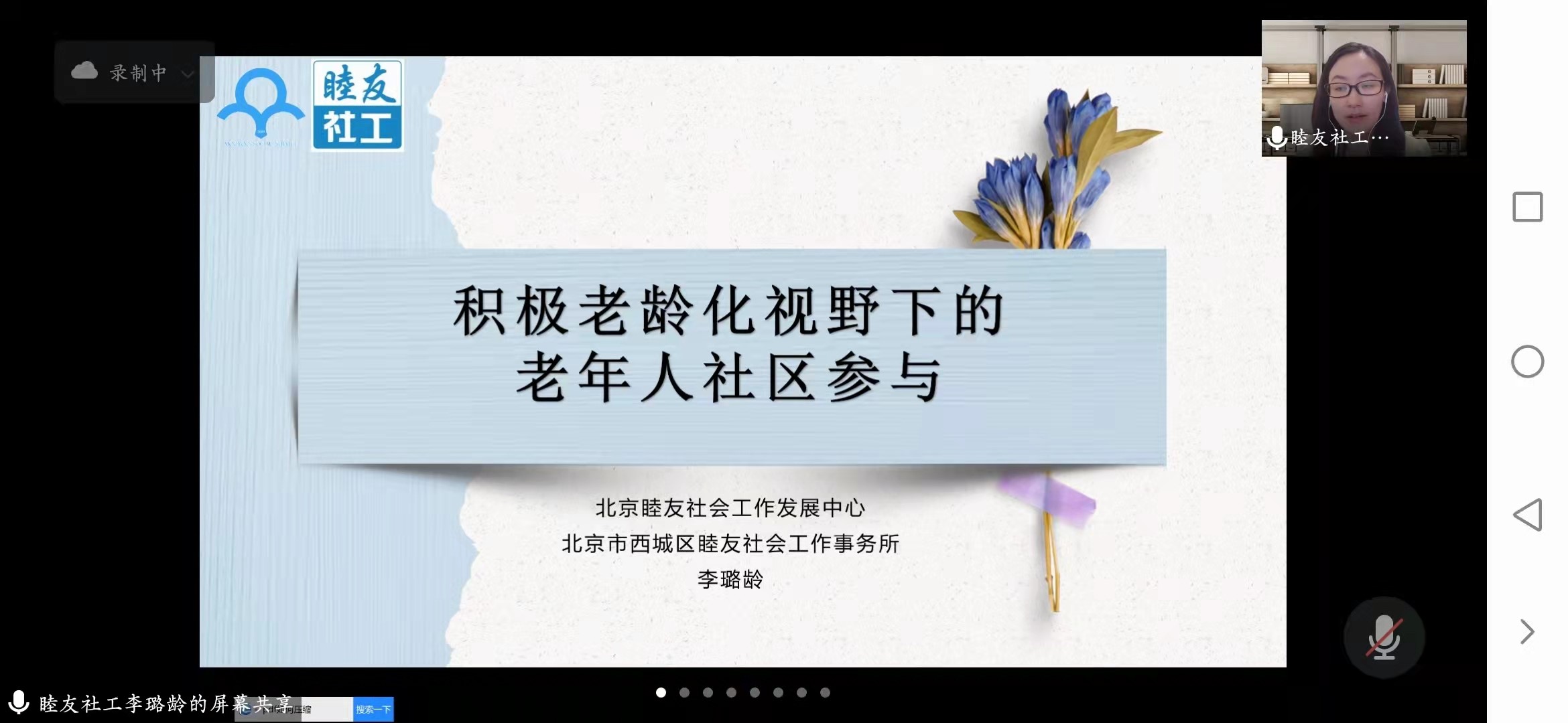 北京市睦友社会工作发展中心主任、高级社工师李璐龄老师以“积极老龄化视野下的老年人社区参与”为主题,从健康、参与、保障三个维度分析了老年人社区参与的意义。李老师指出,一方面以老年人为中心的参与促进,能维持老年人身心健康和避免社会隔离;另一方面以社区发展为中心的参与促进,要强调社区自治,号召居民广泛参与,起到解决社区问题、补充工作力量的作用。在发展以社区志愿服务、社区活动、协商议事、社区社会组织等形式参与的同时,也要考虑到老年人自身参与能力与动机、环境的支持保障和社会文化两方面的影响因素。社工和社区工作者要帮助老年人掌握知识和技能,激发老年人参与动机,控制、规避老年人参与风险,为老年人提供资金、物质支持,兼顾老年人服务和社区发展目标,拓展对社区其他群体的影响力,促进老年群体的多层次增能,为老年人打造和谐、包容的社会生活环境。