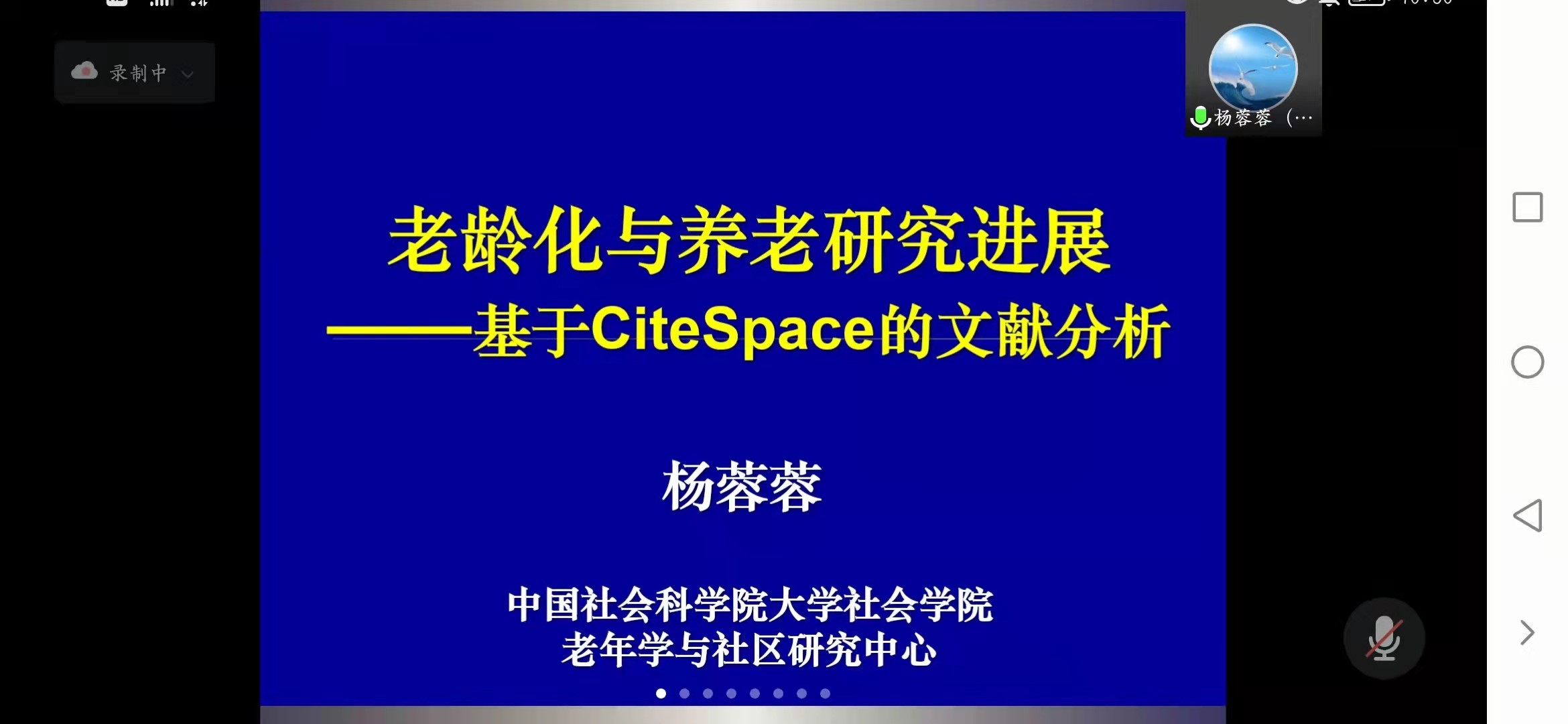 社会学院副教授、老年学与社区研究中心成员杨蓉蓉老师做了题为“老龄化与养老研究进展--基于Cite Space的文献分析”的报告。杨老师以中国“未富先老”和少子化的严峻形势为出发点,运用数据分析、文献查找等方法了解我国老龄化与养老研究基本情况,并从四方面做出分析:一、在发文趋势上,发文量显示老龄化与养老进程密切相关,并呈现出三个时间节点:1997年,受国家养老机制改革影响,发文趋势直线上升;2015年,全面二孩政策放开并未导致生育率大幅度回升,中国出现“低出生率、低死亡率、低自然增长率”阶段,人口转变初步完成。同时,人口老龄化步入迅速发展期,国家开展积极应对老龄化战略行动,发文量波动上升;2015年以后,研究老龄化事业大幅度拓展。二、在研究者分布上,通过知识图谱分布得出研究者众多,但学者之间合作密度指标较低。同时,老龄化在研究学术界产生的影响力越来越大,呈现突飞猛进的趋势。三、在研究机构分布上,老龄化研究机构主要分布在以北京、武汉等地区,呈现一超多强趋势,排名前五的发文机构占全部研究机构的61.94%。四、在研究进展上,研究关注养老保险、养老服务、长期护理等多个领域,呈现由人口老化、家庭养老等具体研究领域到延迟退休、医养结合、城镇化、时间银行等研究领域拓展与创新的转变,研究更加注重与现代结合技术发展结合,分析人群所处的背景和机制动因,并呈现传承与创新的特点。