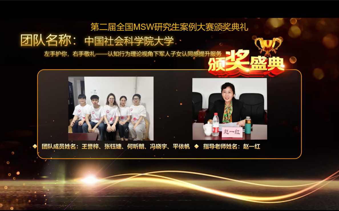 常务副院长、博士生导师赵一红教授指导,2021级MSW王誉梓、张钰婕、何昕朗、冯晓宇、平依帆同学设计的研究项目“左手护你,右手敬礼——认知行为理论视角下军人子女认同感提升服务”,以及韩漫库