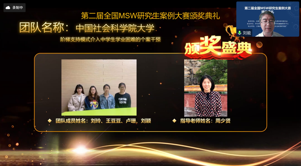 硕士生导师周少贤副教授指导,2021级MSW刘玲、刘颖、卢珊、王豆豆同学设计的研究项目“阶梯式照顾模式介入中学生学业困难的个案干预”成功进入全国三十六强案例。经过激烈角逐,两支队伍均获得第二届“全国MSW研究生案例大赛”三等奖的好成绩。