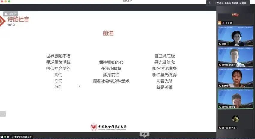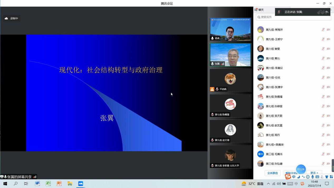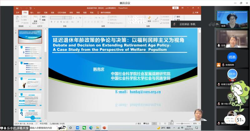 教授、博士生导师,中国社会科学院社会发展战略研究院研究员韩克庆教授为营员们做了以“延迟退休年龄政策的争论与决策:以福利民粹主义为视角”为主题的讲座,讲座围绕民粹主义与福利民粹主义、延退的学术争论、精英与民粹的激辩、民众呐喊VS精英决定等几方面展开。韩教授认为无论是关于延迟退休年龄政策的争论与决策还是其他政策以下结论都具有一定适用性:第一,权力精英最终决定政策出台;第二,民众意见部分影响决策;第三,民粹主义福利权表达较为充分。讲座最后的提问环节,学生们踊跃提问,希望与韩教授有更深入的交流。韩教授也积极给予同学回应和答疑解惑,虽然是线上云讲座,仍然可以看出韩教授严谨务实的治学精神和抵挡不住学生强烈的求知欲。