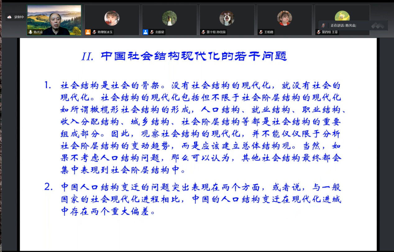 院长、中国社会科学院社会学研究所所长,博士生导师,陈光金教授为营员们做了题为“从全面小康到共同富裕:中国社会现代化的若干问题”的讲座。陈教授首先指出国家和现实社会的发展,需要我们从理论上澄清中国式社会现代化的概念结构,他认为“中国式社会现代化”这一概念结构或许应当囊括民生现代化发展、社会结构现代化、社会治理体系和能力现代化以及社会行为模式和社会规范整合体系的现代性建构四个主要组成部分。陈教授分别就这四个方面做了详细介绍。首先,陈教授谈到“如果说共同富裕是社会现代化的一个基本构成,那么民生现代化发展就是实现共同富裕的根本抓手”,他从民生的公共性层面入手讨论了中国民生现代化发展过程中出现的若干问题,这些问题涉及到就业、收入、住房、教育、医疗卫生与社会保障六个方面。其次,谈到中国社会结构现代化的若干问题,陈教授认为“没有社会结构的现代化,就没有社会的现代化”。他指出,社会结构的现代化不仅仅包括社会阶层结构的现代化,还包括人口结构、就业结构、职业结构、收入分配结构和城乡结构的现代化。除此以外,陈教授还提醒同学们观察社会结构的现代化,并不能仅限于分析社会阶层结构的变动趋势,而应该建立总体结构观。接下来,陈教授谈到中国社会治理现代化的若干问题时指出“社会治理中的国家(政府)-市场-社会关系问题,是建构社会治理体系和能力现代化的理论和实践体系的关键”。最后,关于社会行为模式和规范体系现代转型的若干问题,他指出“在这个领域,国家一直有在不断提出新的主张并努力付诸实践”,这些实践包括“四有青年”“八荣八耻”“新乡贤”等等,然而由于各种复杂的现实原因学术界在这方面的理论和实践研究并不多。