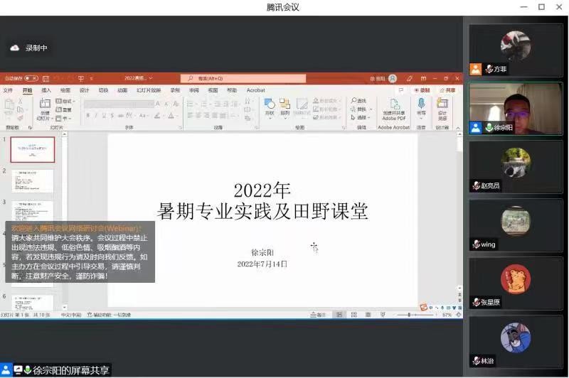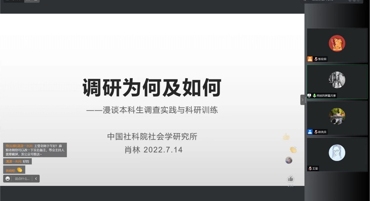 2019级社会学本科生徐圆,她从调研前、调研中、调研后几个环节来讲述。在准备事项中,需要提前和调研对象预约,确定时间地点和介绍信;充分查找相关资料,了解当地的情况;写明调研提纲,包括问题、人员等等;还要关注调研目的地的天气和地理环境。在调研过程中,需要明确分工,注意当地风俗,徐同学还通过自己的调研经历提醒了保密意识、勿介入当地纠纷、不能单独行动等细节问题。在调研后,要记录调研日志,写下调研要点和研究反思等问题,也要注意不要在朋友圈随意发布相关内容,注意录音和各种材料的稳妥保存和处理等。最后,徐同学从今年的暑期调研实践方面给出了自己的建议。最后,赵亮员老师从调研的心态、伦理、安全问题等方面给出了一些建议指导,并对本次工作坊做了总结。