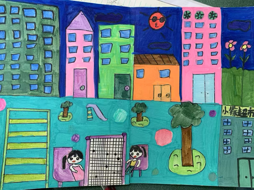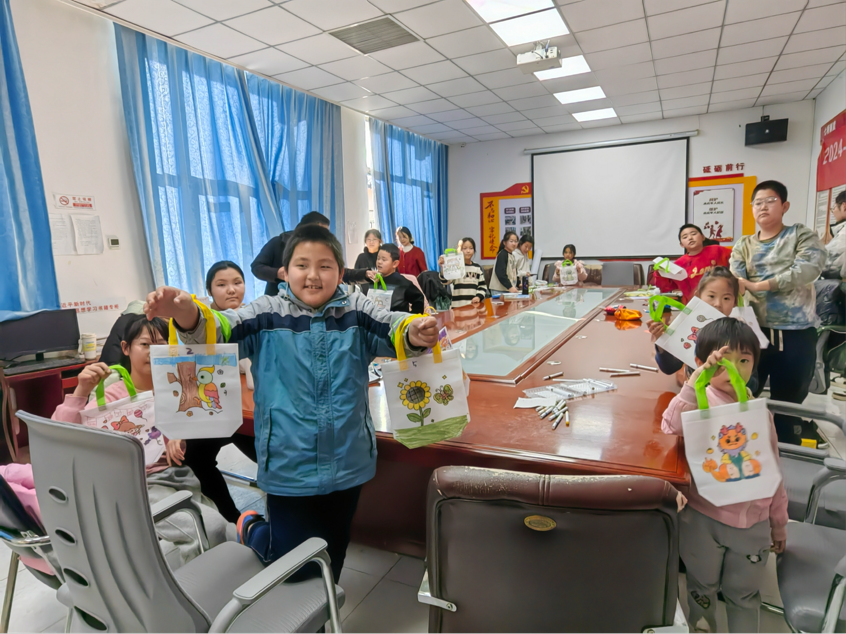 手工实践环节则为孩子们提供了将环保理念转化为实际行动的平台。在社工的指导下,孩子们充分发挥想象力,用彩色卡纸剪出各种形状,写上自己心中最真挚的环保呼吁,如 “垃圾也有他们的家”、“垃圾一定要分类” 等。这些卡片不但承载着孩子们的环保信念,也在向更多人传递环保重要性。在环保袋绘制活动中,孩子们用画笔在空白环保袋上描绘出对绿色生活的向往。蓝天白云、绿树青山、可爱的小动物等元素跃然袋上,每一个环保袋都成为孩子们独特的环保宣言,宣告着自己作为环保小卫士的坚定决心。最后的“理想社区”绘画活动将孩子们的团队协作精神与对美好生活的憧憬推向了高潮。孩子们在巨大的画纸面前热烈地讨论着自己心目中理想社区的模样。在大家的共同努力下,一幅幅充满童趣与想象力的画作逐渐呈现在眼前:蓝天白云下,绿树成荫,鲜花盛开,整洁的街道上车辆有序行驶,垃圾分类投放点标识清晰。这些画作不仅是孩子们艺术创作的结晶,更是他们对未来家园的美好向往与殷切期盼。活动结束后,社工为每位组员颁发了“绿芽环保小卫士”荣誉证书,既作为本次小组活动的结业证书,又提醒他们今后要继续积极参与到环保行动中来。