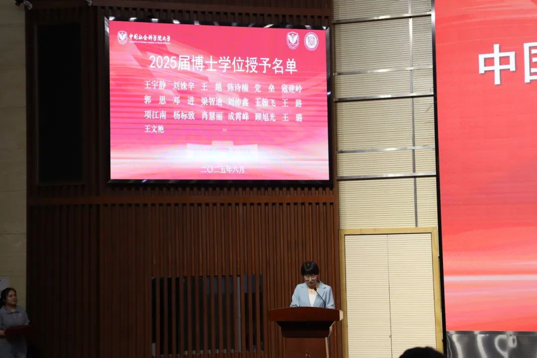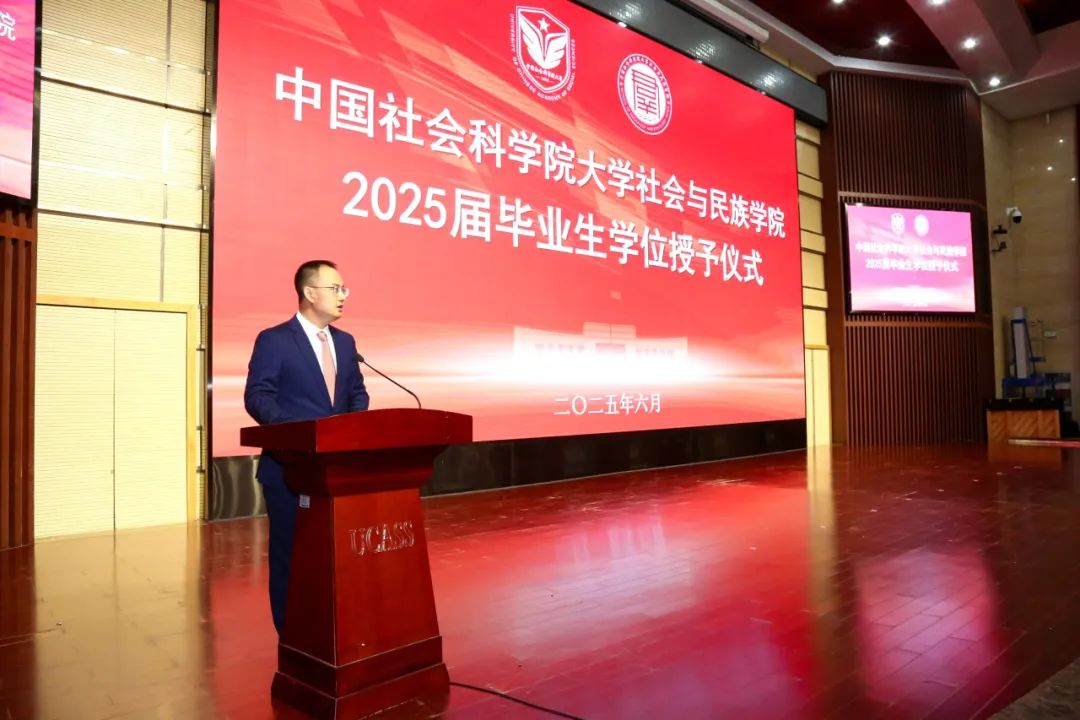 在学位授予仪式上,导师代表中国社会科学院民族学与人类学研究所副所长、博士生导师丁赛教授发表了题为《奔赴山海,迈向更广阔的田野》的深情寄语。她向全体毕业生顺利毕业表示热烈祝贺。丁赛教授回顾了同学们在科教融合特色下,沉浸于中国哲学社会科学前沿“学术田野”的成长经历,汲取丰厚学术滋养,锻炼了独立思考能力。临别之际,丁赛教授向毕业生提出三点殷切嘱托:为学当有“情怀”,即胸怀家国、体察社会、铸牢中华民族共同体意识;为学当有“思想”,即立足国情、追问真理、拒绝搬运西方理论,发出中国声音;为学当有“风骨”,即坚守学术尊严、诚信立身,保持内心的笃定与对真理的敬畏。她勉励毕业生带着社科大的烙印,运用所学知识、同理心与想象力,在更广阔的“社会田野”中探索、理解、行动、关怀,书写无愧时代的精彩篇章。