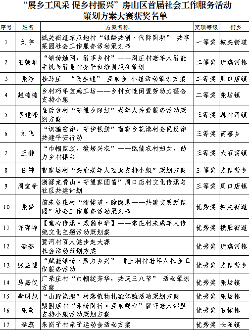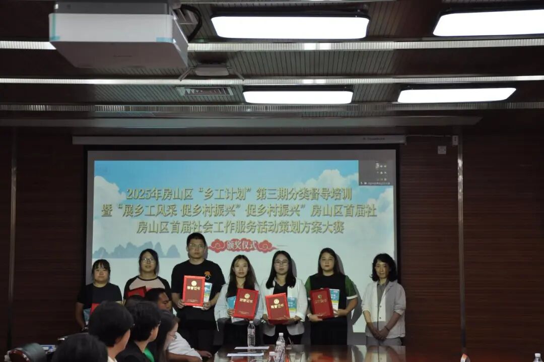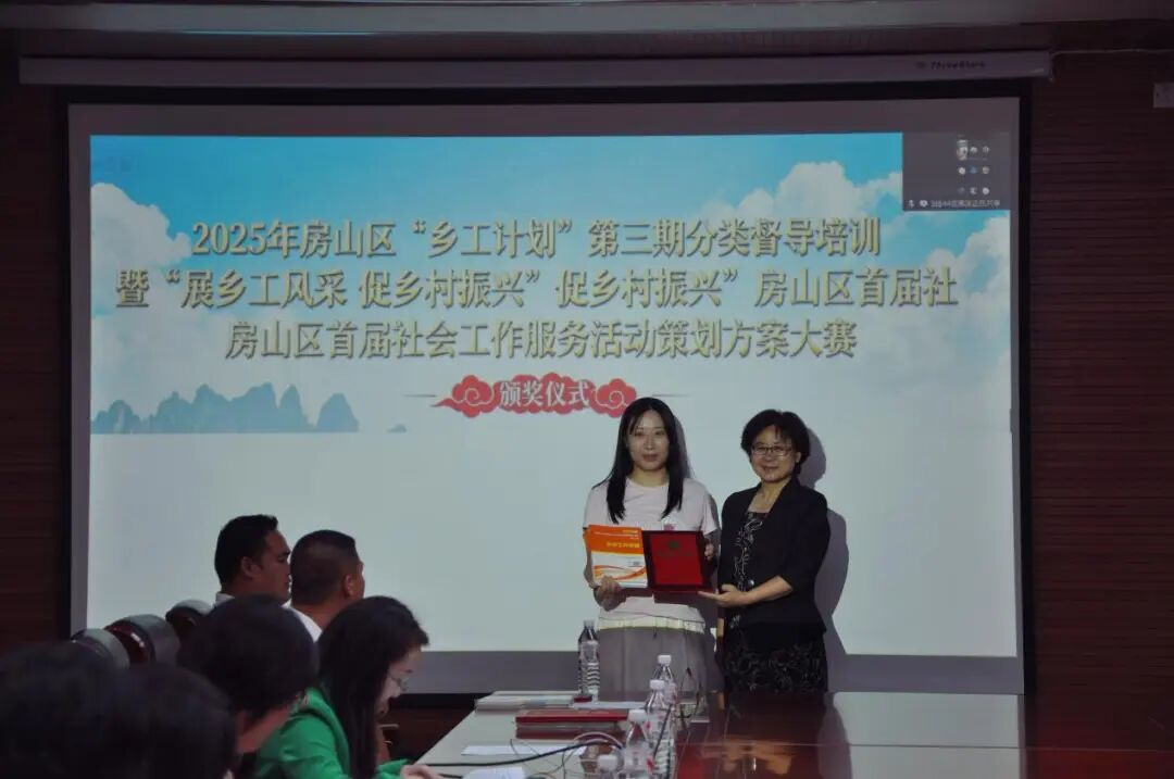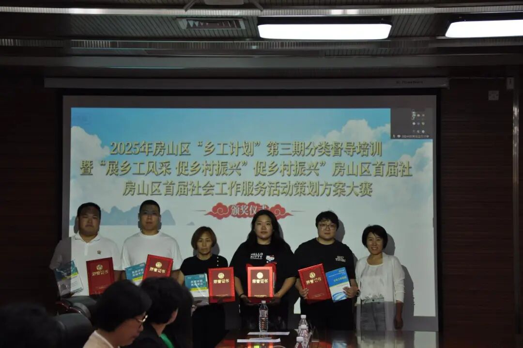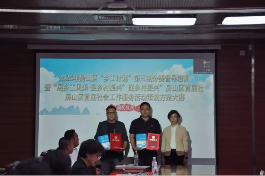 当天下午,房山区首届社会工作服务活动策划方案大赛颁奖仪式隆重举办。本次大赛自2025年5月底启动,累计收到全区23个乡镇(街道)91位乡工方案,内容涵盖“一老一小”服务、人居环境改善、文化兴农、乡村治理等多个领域。经专家严格评审,17份方案脱颖而出,分别获一、二、三等奖及优秀奖。