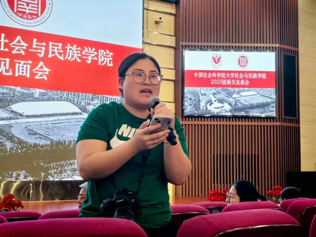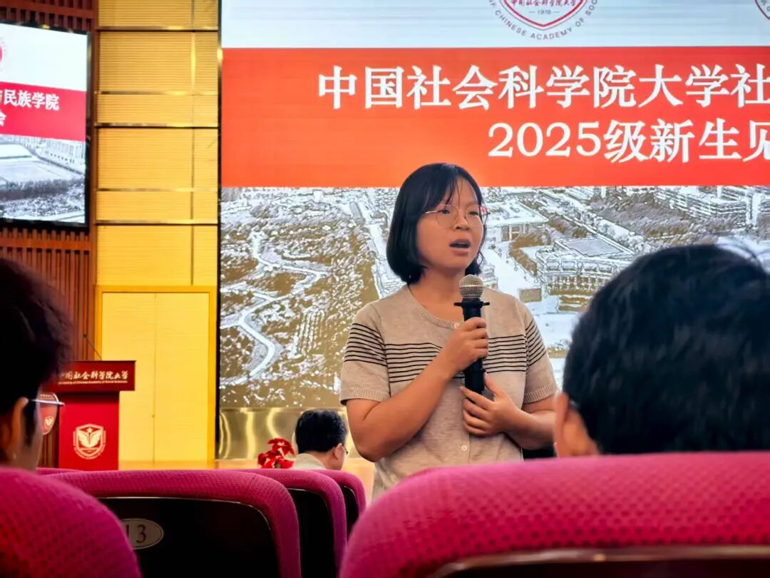 2024级社会政策硕士研究生尚一平作为老生代表,代表全体在校生欢迎新同学。她回顾五年本硕时光,亲历图书馆加装台灯插座、新教学楼拔地而起,见证校园软硬件“华丽升级”。她寄语2025级的新同学:保持探索勇气,敢于跳出舒适区,在课堂、田野与竞赛中让思想碰撞;保持平衡心态,在科研与生活之间留有余裕,用健康体魄与真挚友谊支撑长远学术路。她号召大家以社科人的人文之光点亮现实,把所学所思写进中国大地,与时代同频共振。