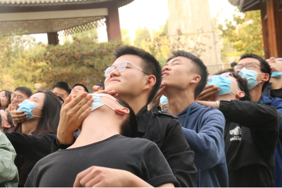 分组完毕,各队同学投入到了激烈的闯关比赛中。按游戏规定,队伍需在每个指定的地点,发挥创造力和想象力,相互合作、默契配合,完成相应的团队任务并在规定时间内上传到小程序。每个任务完成后将获得相应的分数,排在第一名的小队将获得相应的奖,超时的队伍则要受到“意想不到的处罚”。