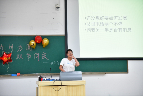 2020年9月29日晚,社会学院“九州方圆、双节同庆”双节晚会在研教楼221教室顺利举办。参加本次晚会的有社会学院党总支副书记张超老师,社会学本科生辅导员翟建文老师、彭奇艳老师,社会工作硕士教育中心白雪松老师、张天帅老师、郑玲老师、李晓雯老师、周芷晴老师以及社会学院在校学生。