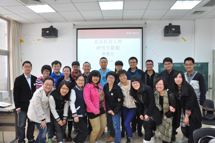 2013年4月14日,由中心尚行社会工作社发起组织的“北京社会工作研究生联盟”筹建会顺利举行,本次会议邀请到(按拼音排序)北京城市学院、北京大学、北京师范大学、首都经济贸易大学、中国青年政治学院、中央民族大学等北京高校社会工作硕士参加。当天下午一个以研究生为主体的联系紧密的专业社工组织筹备成立。