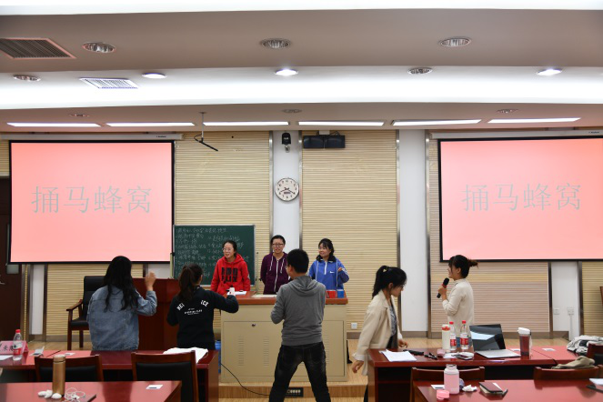 为了活跃现场氛围,在计票环节内加入了“你来比划我来猜”的小游戏,通过肢体语言和富有创造力的表达,让合作者猜出真正的答案,例如“四脚朝天”、“肝胆相照”。游戏活动参与者们可谓是八仙过海各显神通,展示了学生的自身反应能力及小组合作能力。