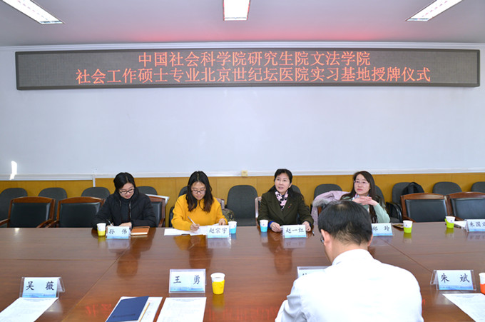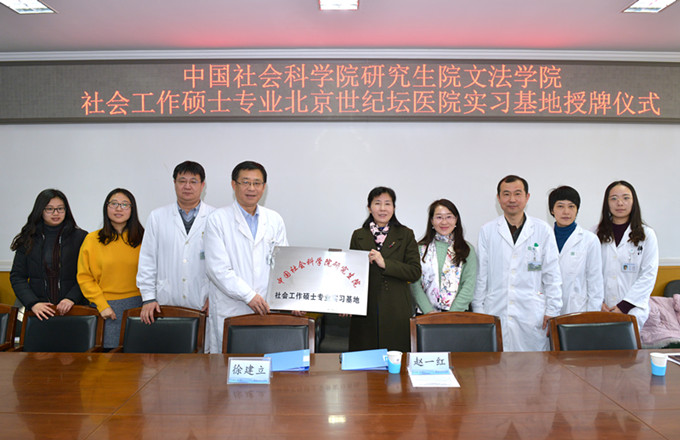 文法学院院长赵一红、社工专业实习管理办公室主任郑玲、赵宗宇和两名社工研究生以及北京世纪坛医院院长徐建立、医务处处长王勇、教育处处长朱斌、医务社会工作管理办公室主任吴薇等相关部门人员出席了本次签约授牌仪式。