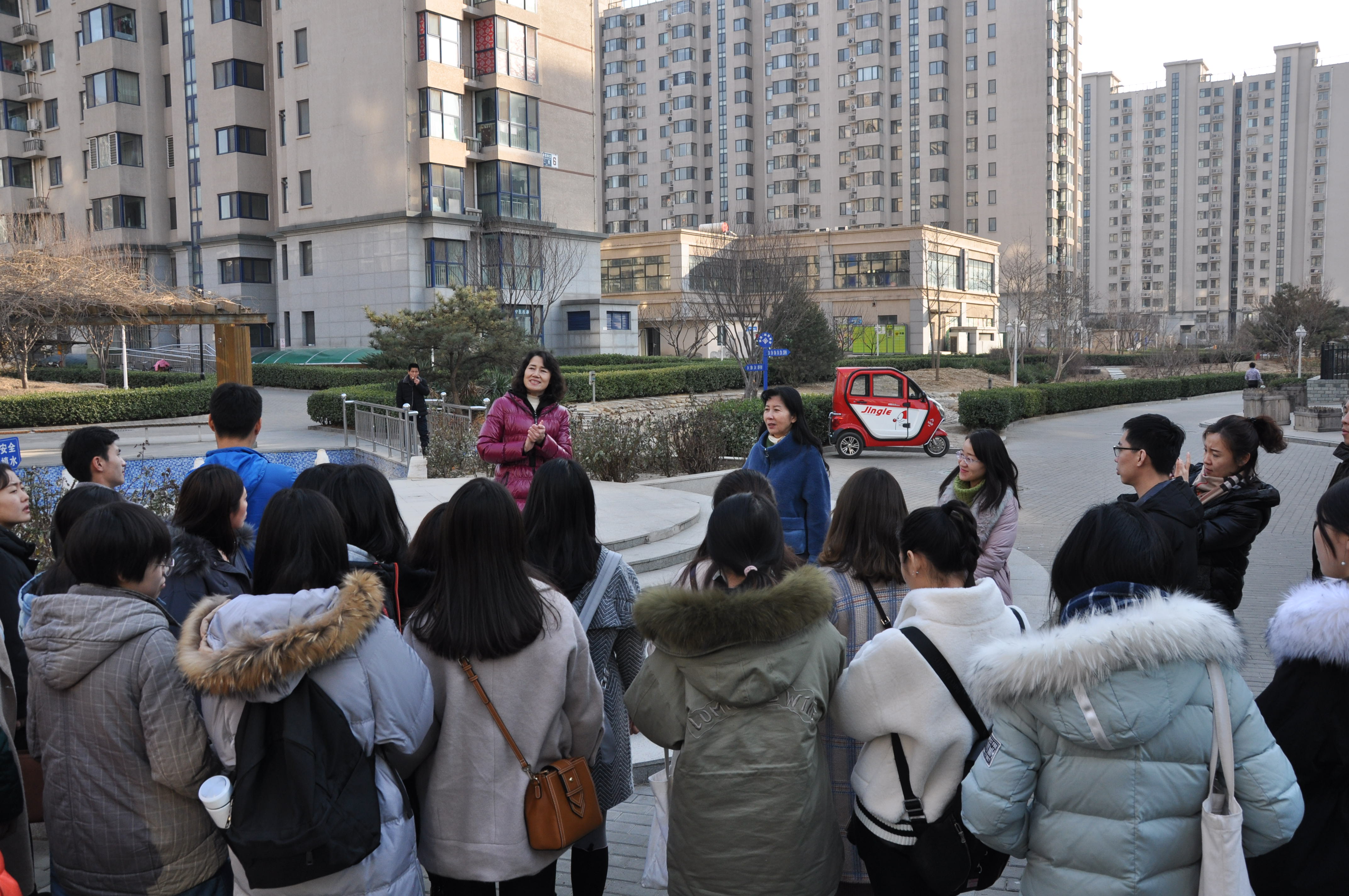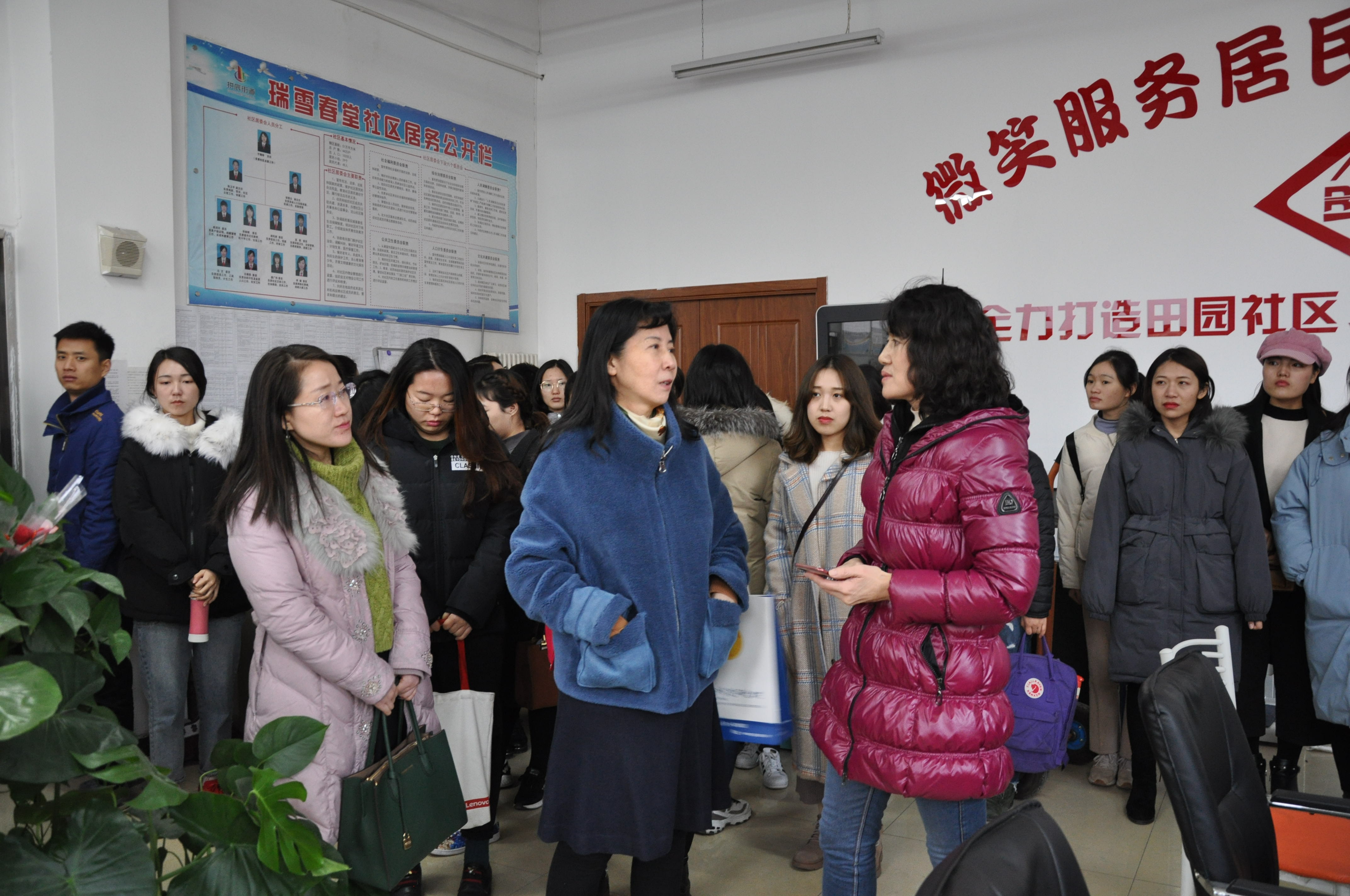 于2018年12月19日下午2点在文法学院院长赵一红教授的带领下走进瑞雪春堂社区,开展了一堂生动有趣的实地教学课。瑞雪春堂社区位于北京市房山区拱辰街道,“瑞雪春堂”,取自“瑞雪兆丰年,细雨润春堂”之意,寄予了大家对本社区的美好向往。社区共计4100户,一万余人。瑞雪春堂社区居委会成立于2011年,自成立以来根据社区居民的需求开展了丰富的社区文化活动,居民们为活动的创办进言献策,积极参与其中,通过活动不仅促进了居民的沟通交流,加强了居民的主人翁意识,也满足了居民日益多元化的需求,营造出了“社区是我家”的和谐氛围。