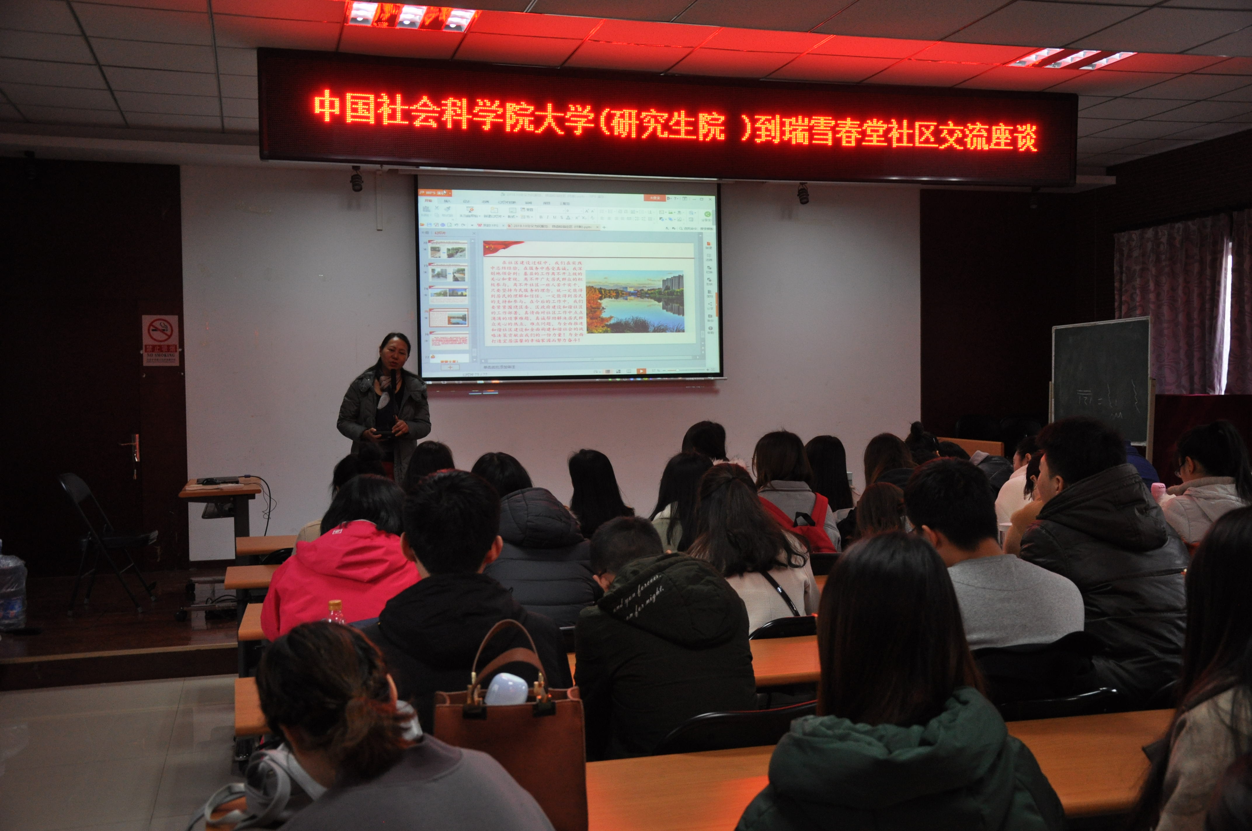 接下来,在社区活动中心,社区居委会陈副主任通过PPT的形式向大家详细的介绍了社区的成立、发展、日常管理、党员教育、志愿服务、如何引导社会力量参与社区服务打造和谐社区等内容。社区以“五方联动、多元共治、共享共建”的理念完善社区服务,着力解决居民难题。同时发挥党员的积极性和居民的自我优势,其实质是社区工作在开展活动时要充分发挥领袖带头作用,调动居民参与社区活动。值得一提的是,“瑞雪春堂”社区把党员的模范带头作用发挥的淋漓尽致,不管其党关系是否在社区内,只要是本社区居民,社区居委会通过各种活动将党员们动员起来加入社区服务队伍中。党员们都积极为社区建设发光发热,有70岁的老党员为社区调解居民纠纷,也有年轻党员争当社区志愿者,通过党员的模范带头作用,带动更多的社区居委参与到社区服务和社区治理当中,推动了社区的和谐健康发展。通过陈副主任的分享,也给同学们带来了更多的专业思考和反思,作为专业社工学生能在社区中充当什么角色,起到哪些作用?同学们结合自己在课堂上所学的专业知识、实地教学中的所思所想向陈副主任提出了一些问题和疑惑,陈副主任很认真的一一为同学们进行解答。