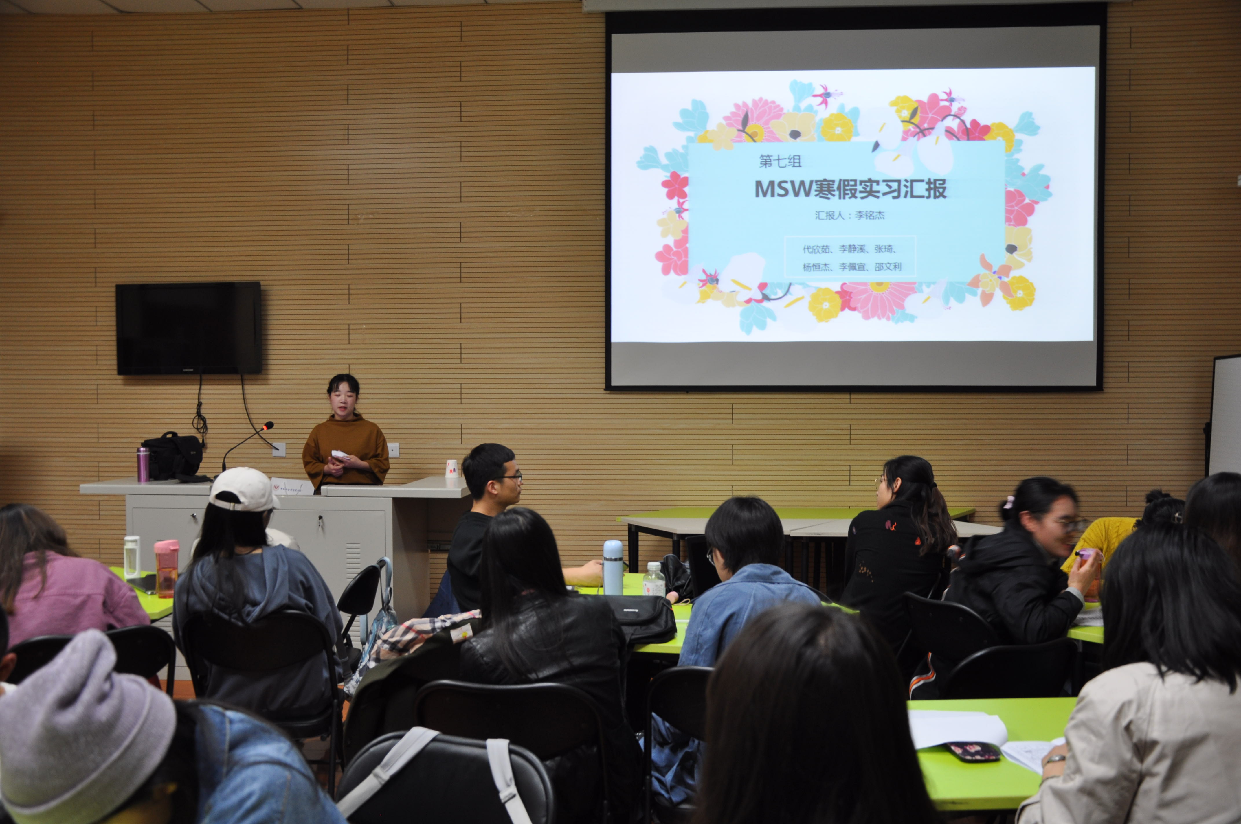 实习总结汇报会采用分组汇报的方式进行,8个实习小组共52位同学,根据现场抽签的方式或推选代表,或轮流发言来汇报本组成员的实习情况,同学们就实习机构情况、实习时数、实习内容、实习收获、存在的问题、专业反思等方面展开介绍。从大家的汇报中能够了解到,寒假实习中同学们涉猎的实务领域较为广泛,包含青少年社会工作、老年人社会工作、司法社会工作、医务社会工作、残障人士社会工作、社区社会工作、扶贫社会工作等,践行了个案工作、小组工作、社区工作、社工行政等多种社工专业方法,坚持社会工作原则,运用社会工作专业知识和技巧开展专业服务,并从中受到了诸多启发。还有同学在汇报过程中对于自己在实习工作中遇到的问题,产生的疑问,希望与老师和同学们进行讨论,获得好的解决办法或建议。汇报会历时5个小时,虽然时间较长,但是同学们始终保持着认真聆听和虚心学习,大家都表示从其他同学的汇报之中收获到了许多宝贵的经验。