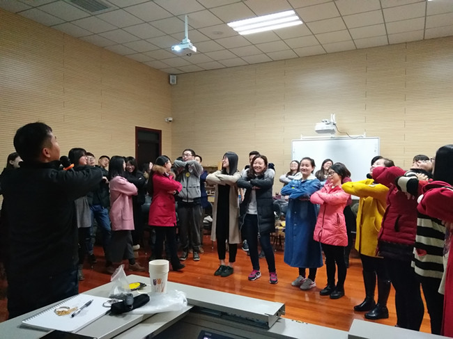 接下来,进入了整个培训课程的核心环节——体验式教学,共分为两个部分:“明日环体验”与“二人组互动体验”。在明日环体验中,同学们两人一组,共同组队完成明日环挑战活动,即两人合作,使用各种方法,最终用一根项链拴住一个下落的圆环。通过自己的尝试和老师的指导,同学们都顺利的完成了挑战并进行了技巧和心得分享,由此引出冰山理论的核心概念,如行为背后的感受、观点、期待、渴望、应对姿态等。冰山理论中涉及的“应对姿态”介于显性行为与潜意识之间,为了更好的对其有一个认知与了解,接下来安排了“二人组互动体验”。该体验要求两个相对不熟悉的同学组成一队,然后在老师的指导下两人进行对视、闭目、感知自我、感知对方、表达感受等,并进行了诸如指责、请求原谅等的角色扮演,同学们积极参与并进行了体验分享。由此,引出了应对姿态的四种形式:讨好、指责、超理智和打岔,彭老师对这几个应对姿态进行了详细的解读和分享。