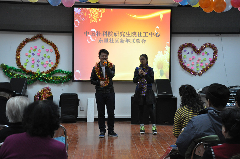 2014年12月29日下午和12月30日上午,“走进社区、关爱老人”迎新年大型社区联欢活动分别在丰台区太平桥东里社区和太平桥西里社区隆重举行。本次联欢会在社工中心主任赵一红老师、郑玲老师和赵宗宇老师的指导下,由14级学生自编自导自演,节目内容丰富、形式多样,迎合老人爱好,贴近老人生活,为社区的老年人带来了新年的祝福,送上了一场丰富多彩的文艺演出!中心通过举办社区新年联欢会旨在丰富社区老年人的晚年生活,提高年轻人关爱老人的意识,同时也加强中心与社区之间的交流,为共建实习实践基地打下良好的基础。