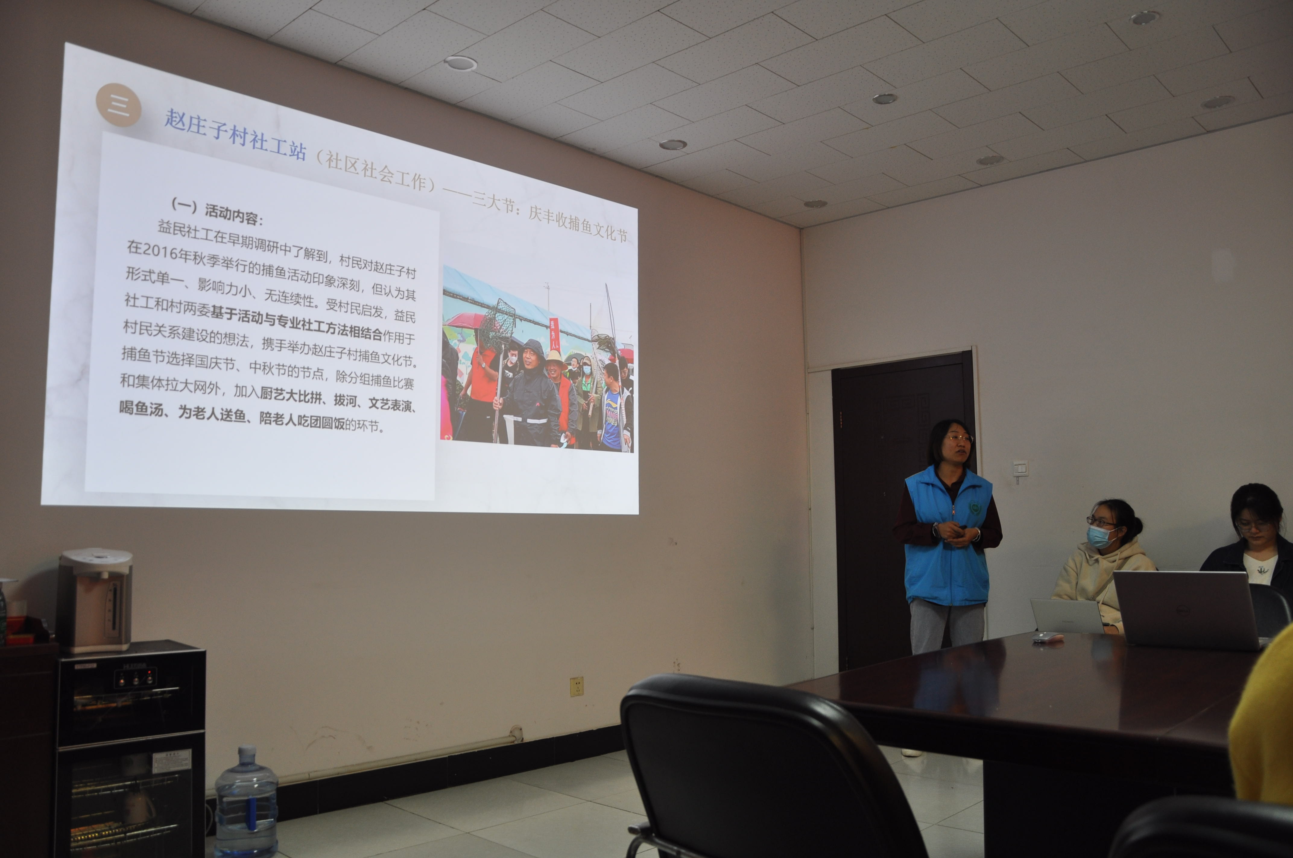 接下来,益民农村社工事务所的社工杨欣然向同学们分享了农村社会工作开展的具体内容,包括资源调查、需求评估、服务开展、成效评估等在内的一般工作流程。益民农村社工事务所以社区社会工作为重点,通过在赵庄子村开展答村民问、创建三大品牌文化节、开展常规服务与主题活动、推动自组织孵化、积极参加抗击疫情行动等有效工作促使了服务对象态度发生很大转变,村庄力量和资源得到优化整合,社工内部能力获得提升。同时,也让大家了解并学习了益民农村社工事务所在党建引领、驻村工作、需求导向等事务方面的良好经验,补充了专业知识。