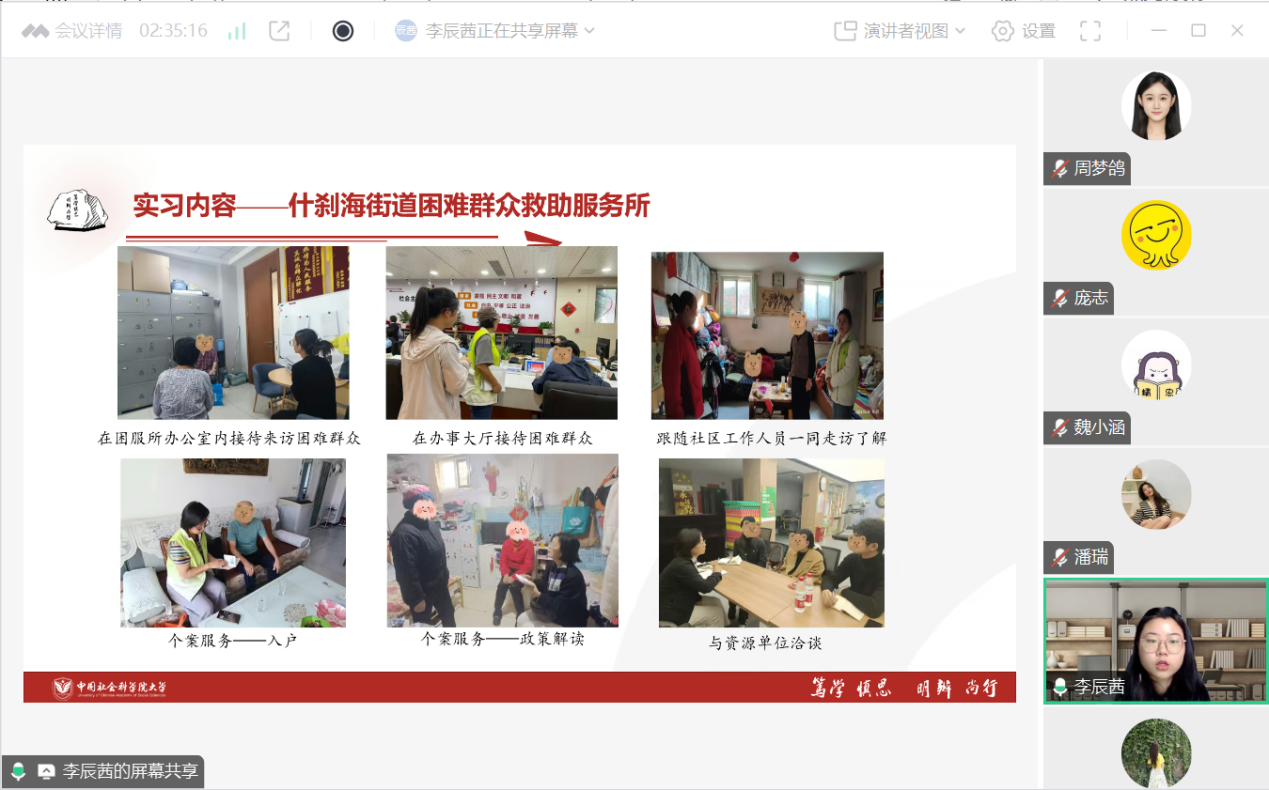 在此次实习汇报中,各位同学纷纷分享了自己在社会工作专业实践中的宝贵经验和深刻感悟。例如,马小可同学跟随社工机构积极参与校舍融合建设熟人社区以及大学志愿者培训项目,在实践过程中,她深刻领悟到策划方案时将社工理论融入其中的重要性,并提出要注重倾听督导的意见和建议;杨欲饶同学将实习划分三阶段,运用相关专业理论为服务对象赋能,同时也总结了自己在小组、社区等社工服务领域方面的成长;张鑫宇同学则从自己的实习经历中总结出了“活动策划”四步法,为今后的相关工作提供了清晰的思路和方法指引,有助于提高实际工作的效率和质量;李辰茜同学在什刹海街道困难群众救助服务所实习期间,跟随社区工作人员走访了解居民情况,还开展了多项个案服务,如入户探访与政策解读,为他们争取更多资源支持,以更好地服务案主;陈柯燃同学以家暴目睹儿童为服务对象,开展了反家暴剧团、“同心圆”女性支持小组、“小熊猫”儿童零暴力成长计划等专业服务,她意识到,社工的力量可以更好更高效更广阔范围的发挥,在儿童保护领域的干预可以更加精准;王筠焯同学表示,社会工作者最重要的能力就是与服务对象建立信任关系,信任关系的建立是一切服务的前提,她在服务对象接触的过程中体会到人与人之间纯粹的美好,并会带着这份感动与热爱去开展服务,让自己的服务更有温度。