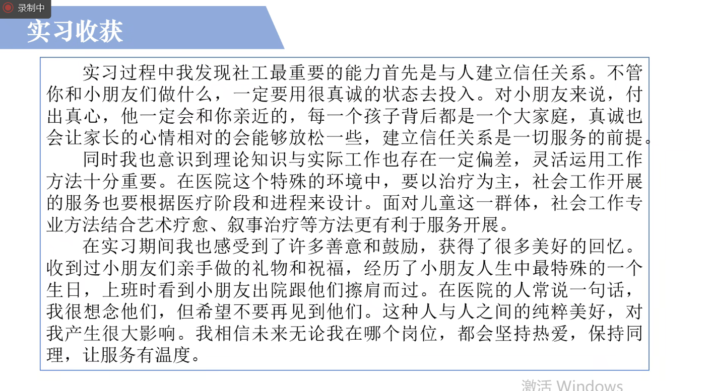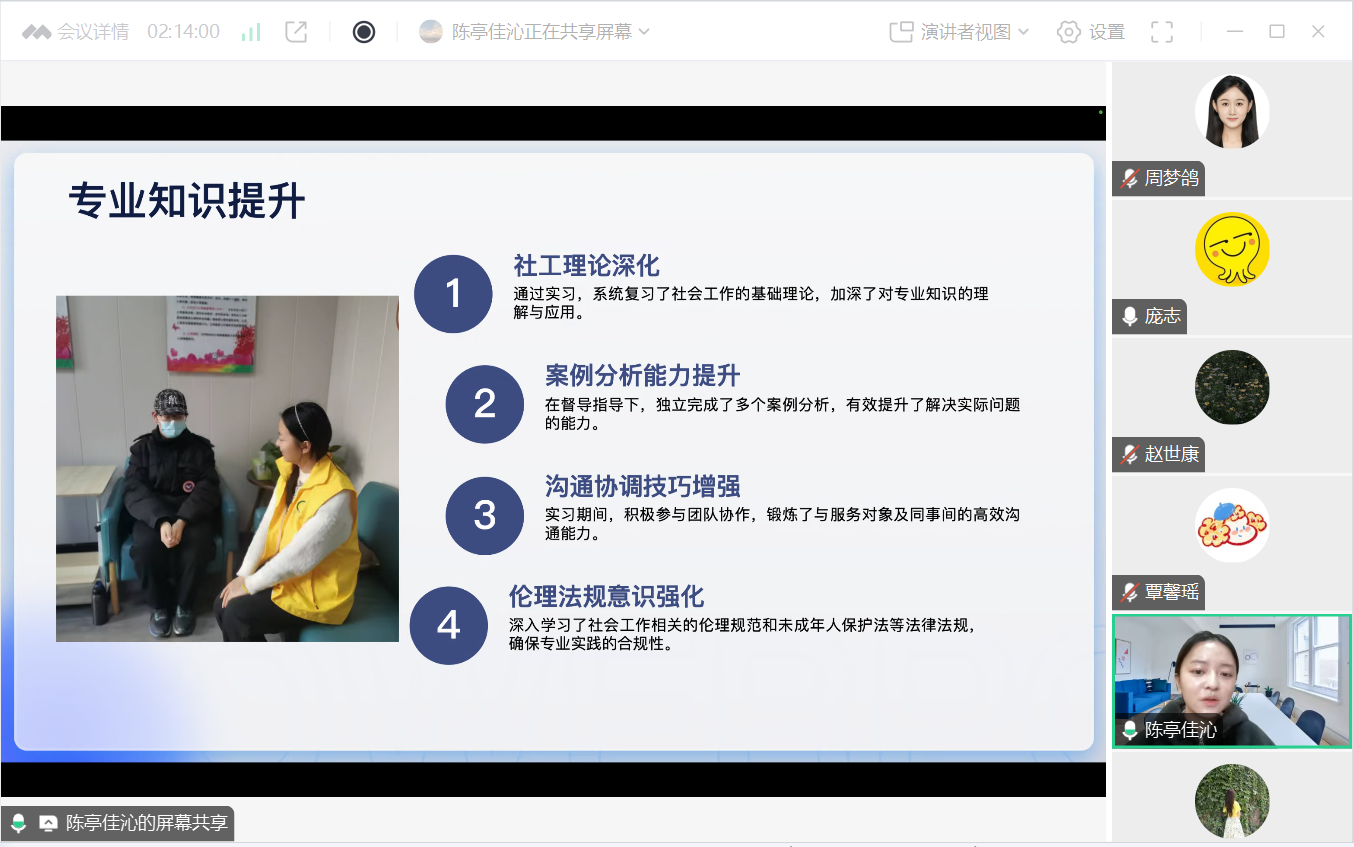 答辩过程中,社工学生借助PPT的形式,生动地讲述自己在实习单位的所见、所闻、所感,围绕实习单位概况、实习内容、实习成长收获、实习挑战与经验提炼以及专业反思等方面进行了全面总结与分享。此次实习,同学们涉足领域广泛,实习单位涵盖了社会工作的多个重要领域,如社区、儿童、医务、老年、司法、行政等,服务对象也呈现出多样化的特点,包括困境儿童、残障人士、未成年人、老年人等不同群体。