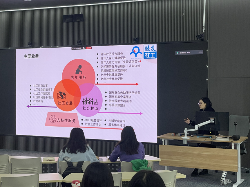 李老师指出,中央社会工作部成立后,对社会工作提出了新的期待和要求,社会工作在基层治理中的定位逐步从传统人群服务转向社区治理。她结合自身所在机构的发展历程指出,机构自2009年成立以来,初期聚焦老年服务,构建了“养老机构—医院—社区”三位一体的服务模式,覆盖老年人全生命周期;自2013年参与社区社会组织培育项目起,逐步深入社区治理领域。李老师结合丰富的实务经验,分享了自己在开展老年社会服务中获得的感悟,以及在机构发展过程中面临的挑战,如社会救助中对个案服务能力的考验、社区治理中专业方法的不足等,强调社工需在实践中不断摸索与总结,形成本土化的工作经验。她提醒同学们,从学校步入社会实践中可能会遇到课本知识与实际工作脱节的情况,在为特殊人群提供服务前,需先深入理解该群体的特点与需求,才能进一步有效开展服务。