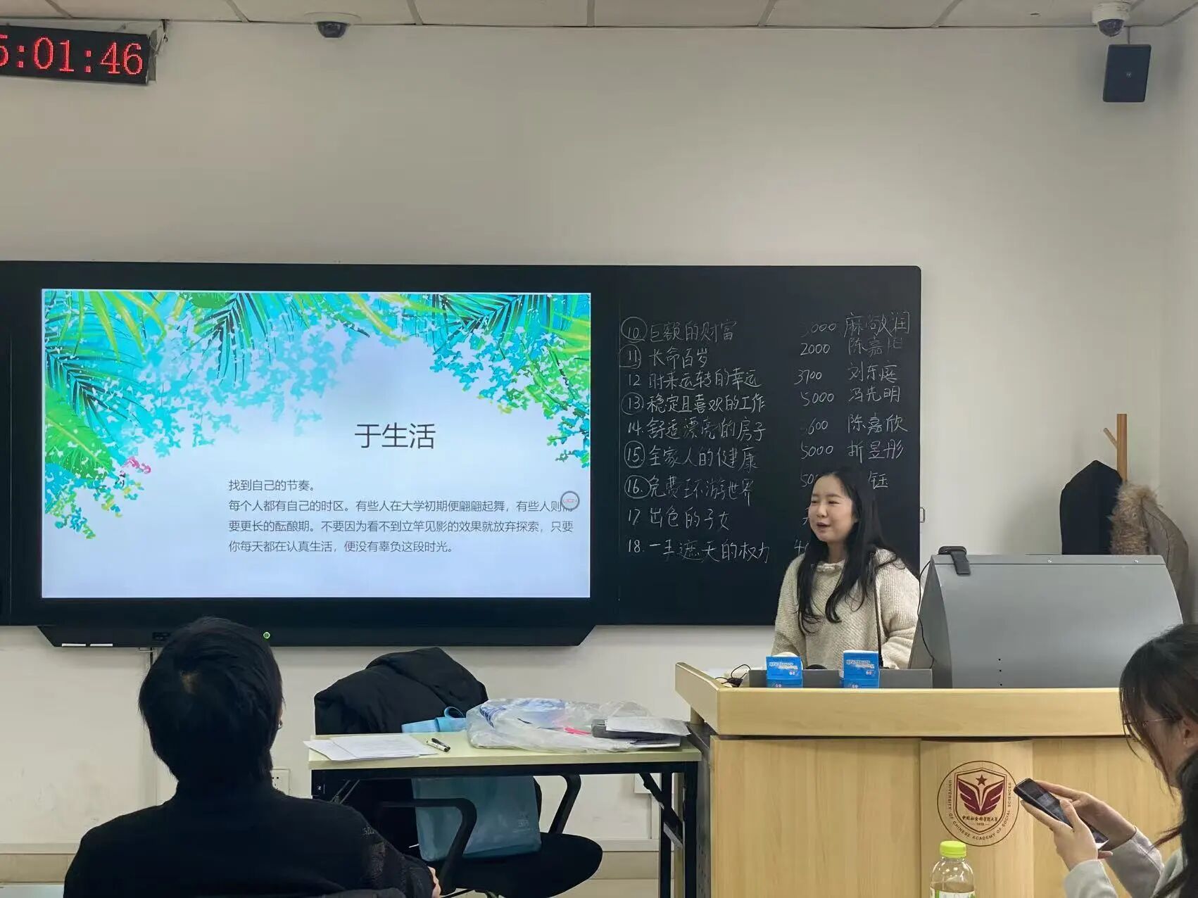 接下来,活动进入“高中与大学学习生活对比分享”环节。大家首先观看了一段“我们的高中生活”回顾短片,唤起大家的共同记忆,规律的作息、紧密的课程安排与明确的目标。接着,新生们结合入校以来的真实体验,分享了高中与大学生活的不同。一位同学说:“高中时每天都有老师带着走,现在要学会自己安排时间,一开始真的不习惯。”另一位同学则表示:“大学的课程内容更多样,需要主动去图书馆、找资料,感觉更有挑战,也更有意思。”分享现场气氛活跃,主持人也在互动中鼓励大家主动适应变化,找到自己的节奏。
