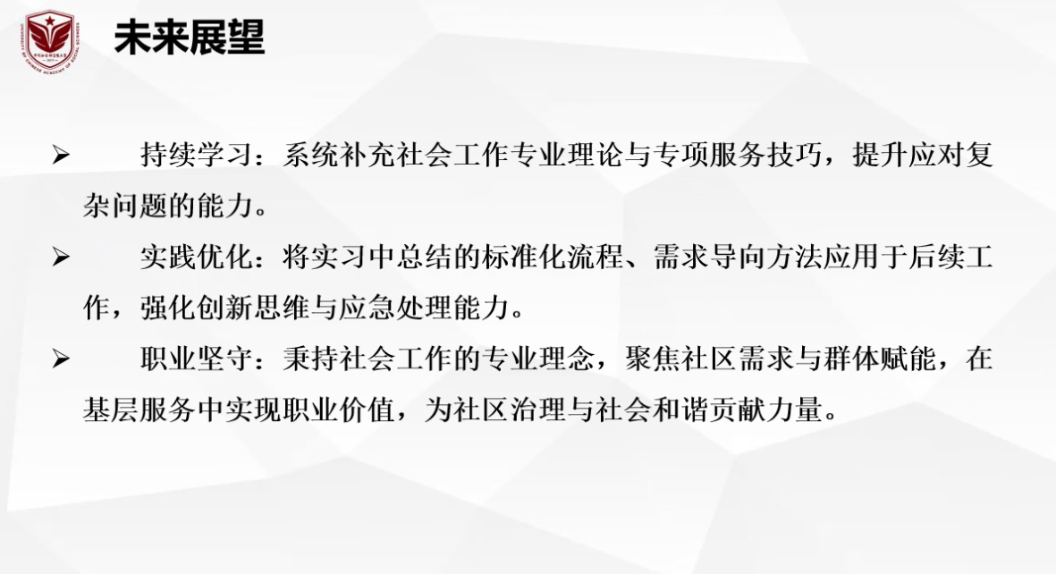 专业实习是从课堂走向社会的重要桥梁,也是专业价值内化与能力建构的关键阶段。通过本次实习总结汇报会,同学们系统梳理了实习经验,明确了后续提升方向,也为学院进一步优化实习实践管理与督导支持提供了参考。下一步,学院将继续完善实习指导与评价机制,助力同学们在未来的学习与职业道路上持续成长。