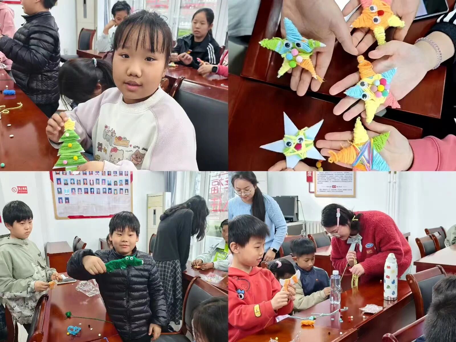 创作过程中,社工全程巡回支持,重点关注羞怯组员,给予低干扰陪伴与协助;鼓励组内轻量互动,引导孩子们互相分享创作灵感与手法。指尖穿梭于毛线之间,压力与烦躁在重复缠绕的动作中慢慢消解,不少孩子边创作边与同伴交流,现场氛围温暖而治愈。