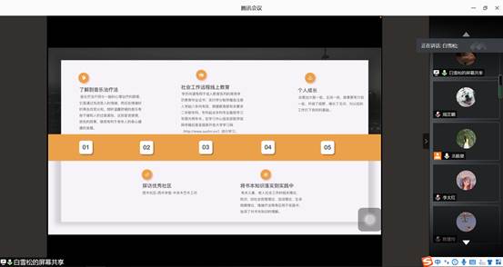2021118日——19日,2019MSW学生专业实习总结线上答辩会在腾讯会议成功举办。社会学院学生管理与实习实践办公室副主任郑玲老师,实习管理周芷晴老师参加了本次答辩会。答辩开始之前,郑老师首先恭喜大家虽然在遭遇了因疫情影响不得不中断线下实习而转为线上实习等诸多困难的情况下,但都努力克服了各种困难险阻并顺利完成了专业实习,为大家点赞;其次,郑老师向同学们介绍了实习答辩的流程、重点内容以及注意事项,提醒大家注意时长和把握好答辩重点。本次实习答辩分班级进行,三个班级每班半天时间,同学们根据学号顺序依次进行答辩。