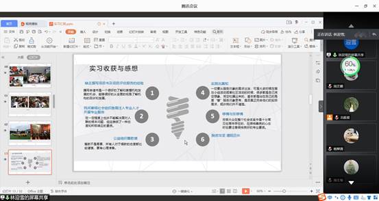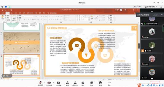 根据答辩安排,65位同学依次做了线上总结汇报。同学们为实习总结答辩进行了充分地准备,展示了丰富的实习资料和照片,着重介绍了实习中的收获与成长以及实习遇到的困难和特色,并对实习经验、问题与专业反思做了较为深刻的分享。