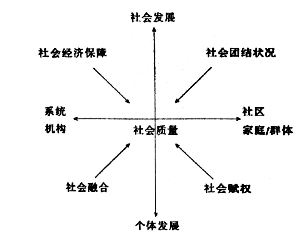 抽象地看,社会发展质量就是社会发展过程中内在特性满足需要的程度。具体地看,不同地区的学者在对社会发展质量的认识上存在一定的不同。就社会质量理论的起源地欧洲来说,Wolfgang Beck等欧洲学者认为一个社会质量较高的社会,是一个以社会正义、社会团结等理念为核心价值的社会,是一个民众能深度参与到社会经济共同体,并拥有提升自身福利的空间和潜能的社会;在中国的语境下,社会质量主要主要指的是政治引领下的社会有序发展的状态,这种状态包括社会发展方向和水平、社会发展价值、规范和支撑条件等方面。操作化到社会发展质量指标的层次上,Wolfgang Beck等人认为社会发展质量的高低由社会经济保障、社会团结、社会包容和社会赋权四个条件性因素来衡量;在中国,社会质量的指标则被分为两大类:物质性指标和价值性指标。物质性指标包括:历史发展的道路、经济发展的水平、人口、沟通(通讯和交通)、教育和文化;价值性指标包括:整合、自主、自律、稳定、适应、开放。