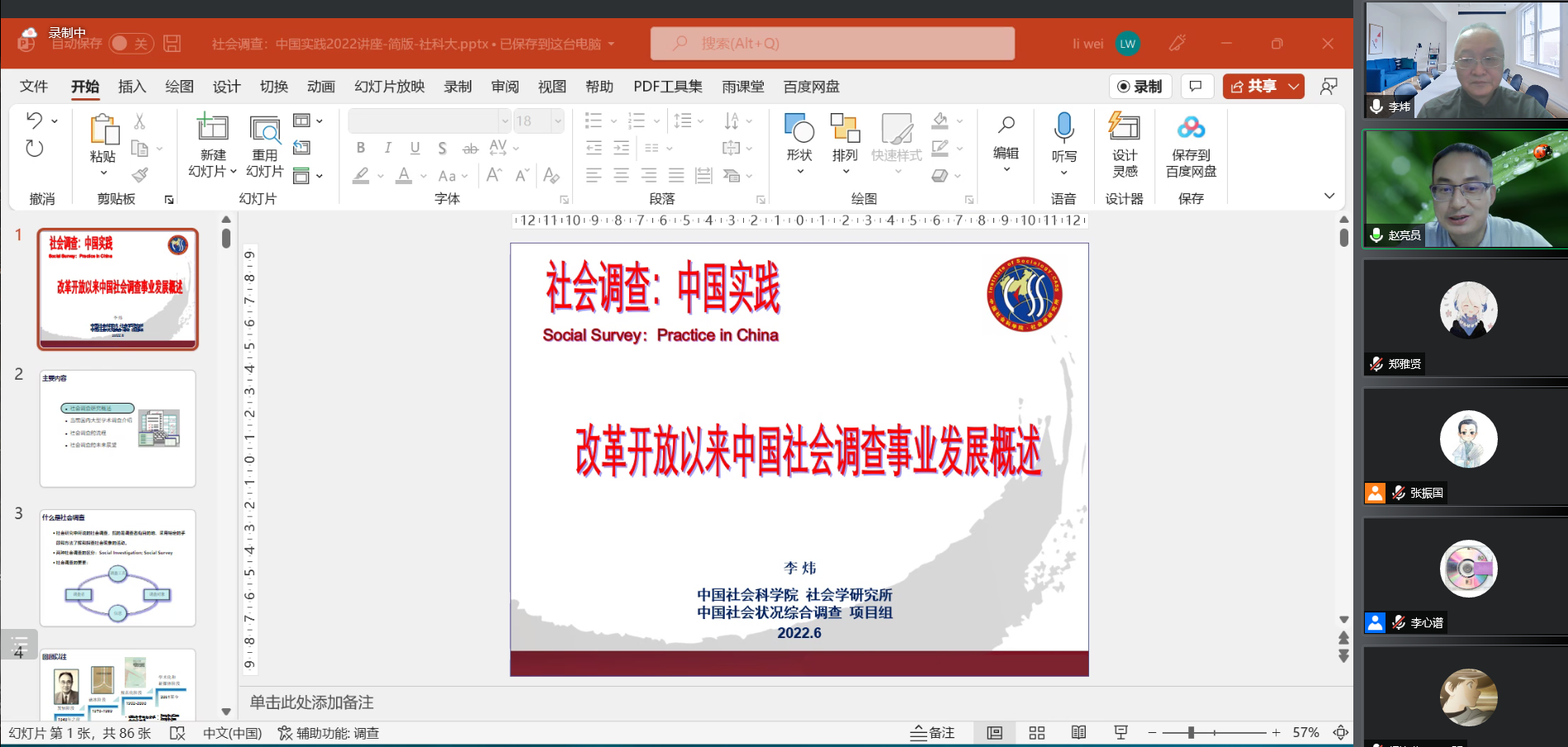 信息中心讯|2022年6月10日,中国社会科学院社会学所研究员、“中国社会状况综合调查”(CSS)首席执行专家李炜老师做客社会学院笃学讲堂,带来“改革开放以来中国社会调查事业发展概述”专题讲座。社会学院笃学讲堂由社会学院主办,社会学院信息中心、社会学社协办。社会学院赵亮员老师主持本次讲座。