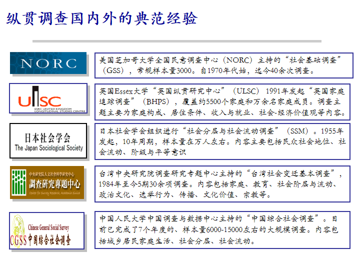 在第二部分,李炜老师介绍了当前国内的主要大型社会调查项目,如北师大中国收入分配研究院发起的中国家庭收入调查(CHIP)、社科院社会学所发起的中国社会阶层状况调查、中国人民大学中国调查与数据中心执行的中国综合社会调(CGSS)、北京大学中国社会科学调查中心实施的中国家庭追踪调查(CFPS)、西南财经大学发起的中国家庭金融调查(CHFS)[1]。