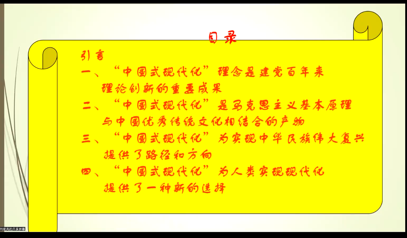 何老师最后认为,“中国式现代化”目前是正在进行时,还必须不断完善和创新。中国式现代化并不属于国外学者所说的纯粹的“回应型”现代化模式,而是“回应——创新”型的现代化。发展和完善“中国式现代化”,既要重要“社会现代化”,更要重视“人的现代化”。相信在建国一百周年之际,“中国式现代化”将发展、完善成为世界上最有吸引力和影响力的现代化模式。