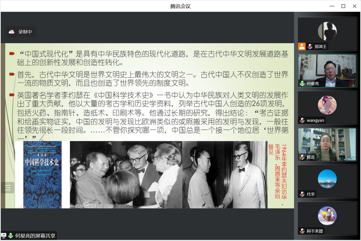 接下来,何老师向我们阐述了“中国式现代化”是马克思主义基本原理与中华秀传统文化相结合的产物这一论点。毛泽东早在上世纪上半叶便强调民族自信和文化自信。十八大以来,习近平继承和发展了毛泽东思想,提出了“文化自信”的理念。“中国式现代化”理念具有深厚的中华文化根基。“中国式现代化”是马克思主义基本原理与中华优秀传统文化相结合的产物,是符合中国国情、历史和文化传统及民族特点的现代化道路,是在古代中华文明发展道路基础上的创新性发展和创造性转化。当代中国人继承和弘扬祖先的创新精神,在古代中华文明的基础上创新,形成了形成“中国式现代化”发展道路,创造了与西方文明不同“人类文明新形态”。