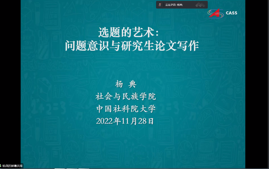 2022年11月18日下午2点,中国社会科学院社会学所副所长、博士生导师杨典教授主讲的“选题的艺术:问题意识与研究生论文写作”作为“研究生经典学术讲堂”第3讲在腾讯会议线上举行。本次讲座由韩漫库