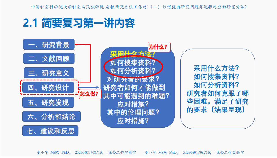 在工作坊的第三讲——如何撰写质性研究论文。首先,童老师分享第二讲中的下半部分之如何分析质性研究资料,包括质性研究资料的类型、分析的目标、分析的常用方法,并具体介绍了七种分析质性资料常用方法,包括内容分析法、话语分析法、文本分析法、主题分析法、Glaser的扎根理论分析方法、Glazzi的现象学七步分析法。