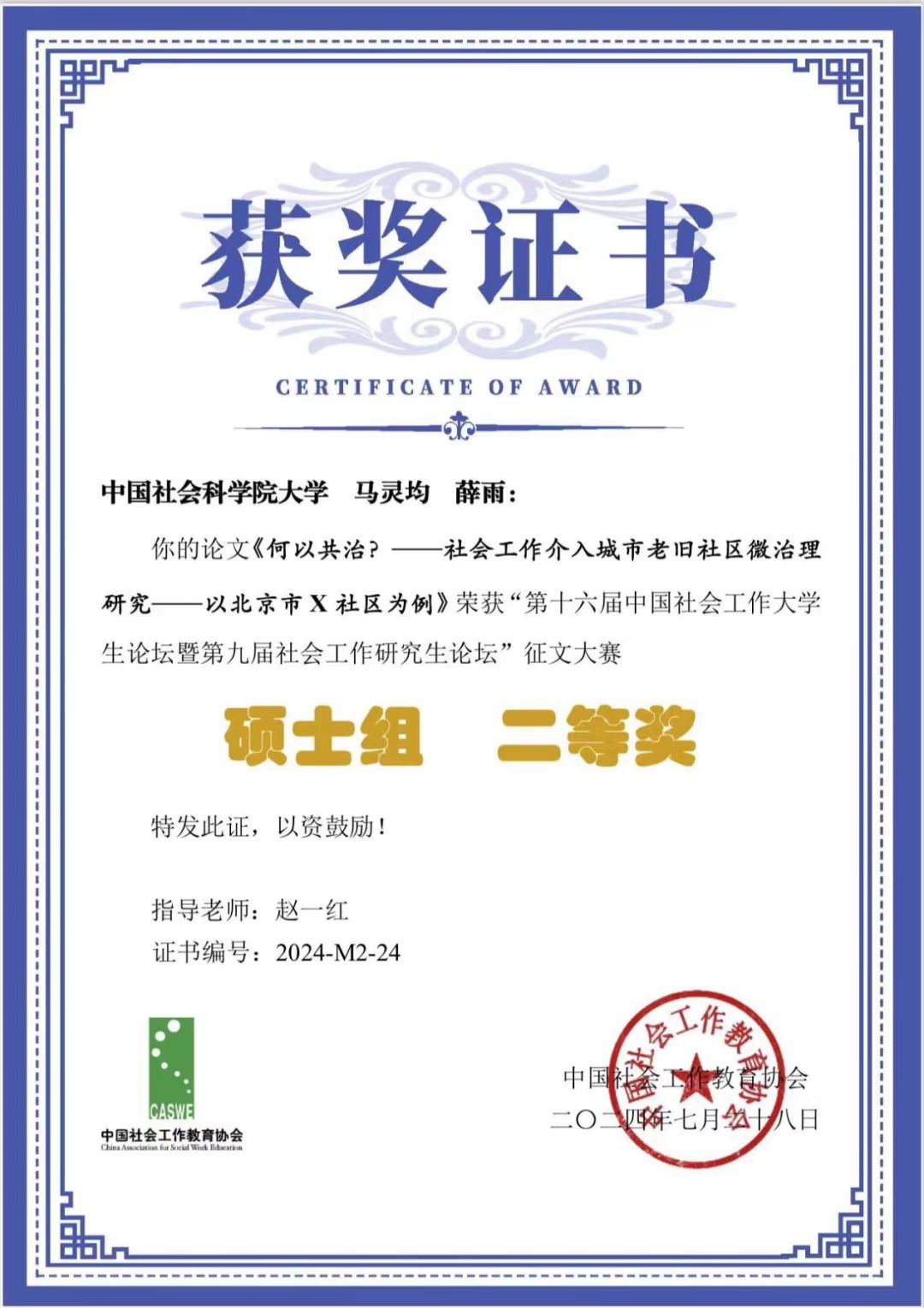 2023级社会工作硕士研究生马灵均、薛雨、赵世康、庄洁、张开阳撰写的论文(共3篇)入选论坛正式发言名单,其中,马灵均、薛雨获硕士组二等奖,赵世康、庄洁、张开阳获硕士组三等奖。