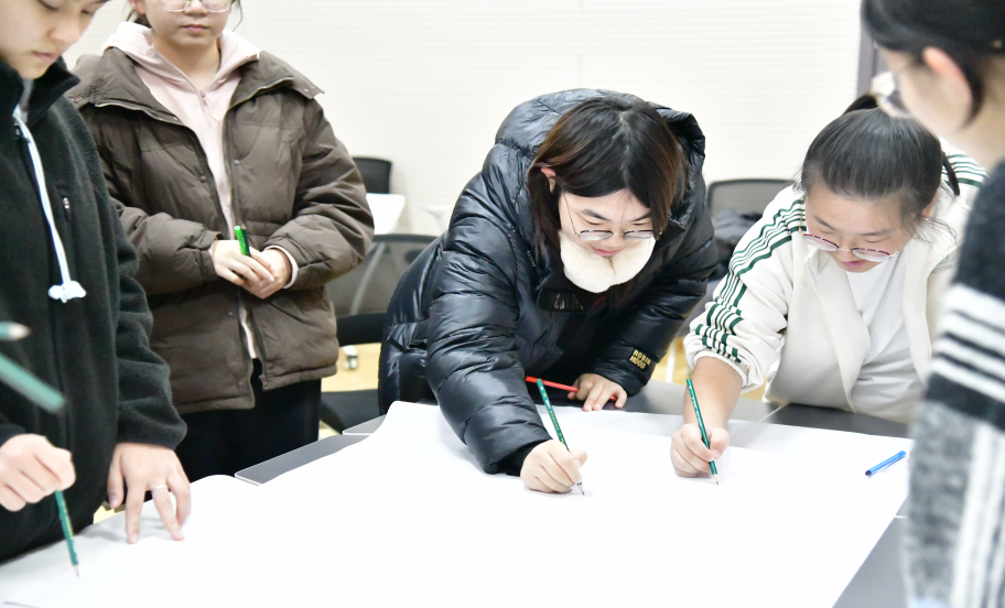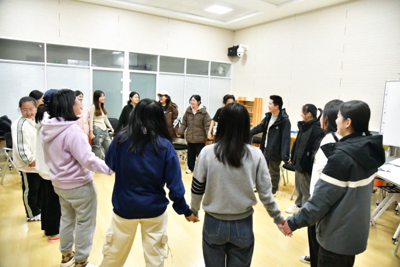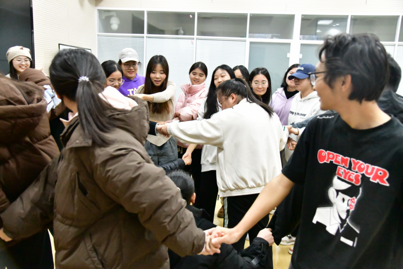 而后,进行“合解千千结”活动。小组组员先手拉手围成一个圆圈,记住自己左手和右手边的人,闭上眼睛,在指定范围内随意走动,听到主持人“停”的指令后,迅速找到原来左手和右手的人并拉手成结。在不松手的情况下,通过钻、跨、绕等方式解开这个结,恢复到最初的圆圈形状。通过该活动,小组组员体验到了团队合作的力量,发现了沟通与信任的重要性。