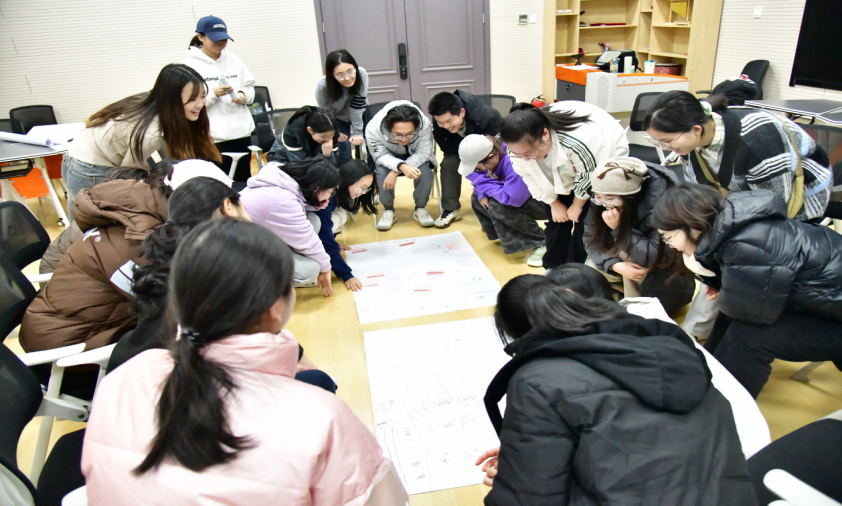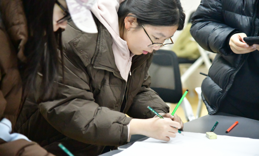 绘制过程中,组员们先绘画了学校的建筑,如宿舍、下沉广场、北综合楼、超市、餐厅等,而后又增加了柳树、外卖员、小动物等元素,最后在空白地方绘画了期待建成的建筑,如KFC、文创书店等,组员通过借笔、互相了解校园的方位和要素等加强了彼此的互动与交流。绘制结束后,由每位组员依次对自己绘画的部分以及对学校的印象进行分享,组员在分享时不仅对学校的建筑进行了描绘,还将自己的个人生活与学校进行了连结,如,其中一位组员分享其绘画超市的原因是自己在校园生活中经常光临超市。最后由主持人进行总结,小组组员对于学校认识的共同关键词是“神奇”。